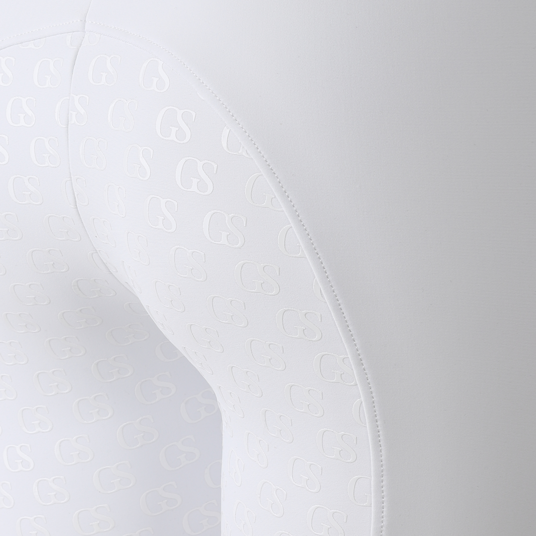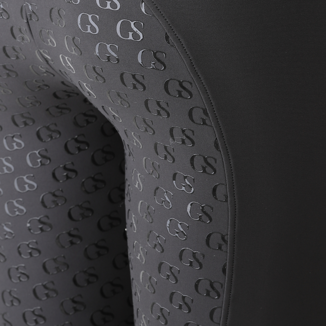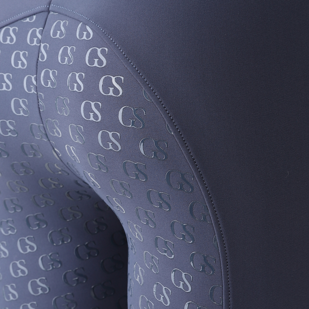 The 'GS' patterned silicone grip is new to the GS Equestrian range, and offers a stylish look, whilst also being effective. Being a full seat riding tight, the silicone is coloured as the same colour as the riding tights so that blends into the stylish design, as it covers a large proportion of the riding tights. In addition, there is a GS logo on the left leg, which has reflective hint to it.