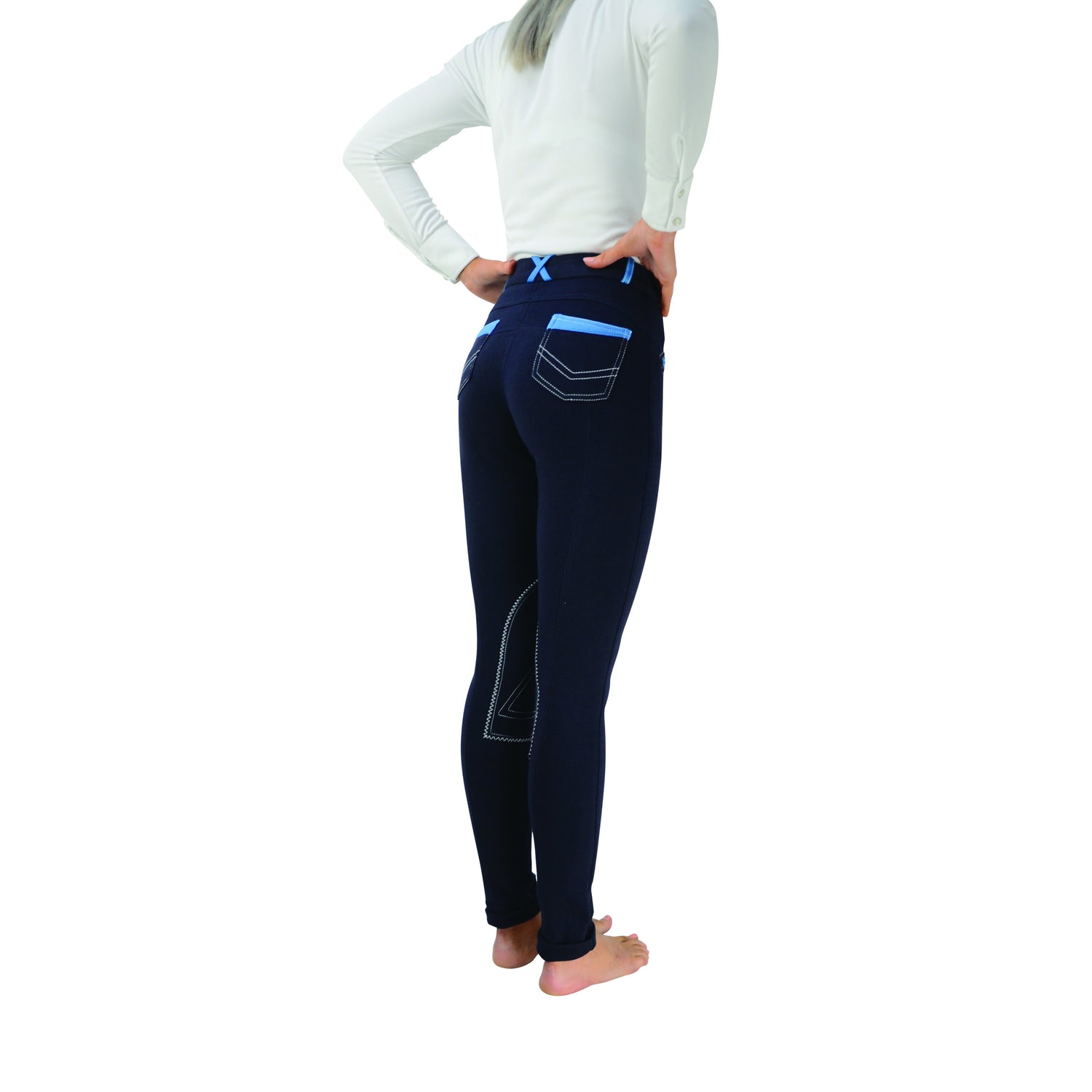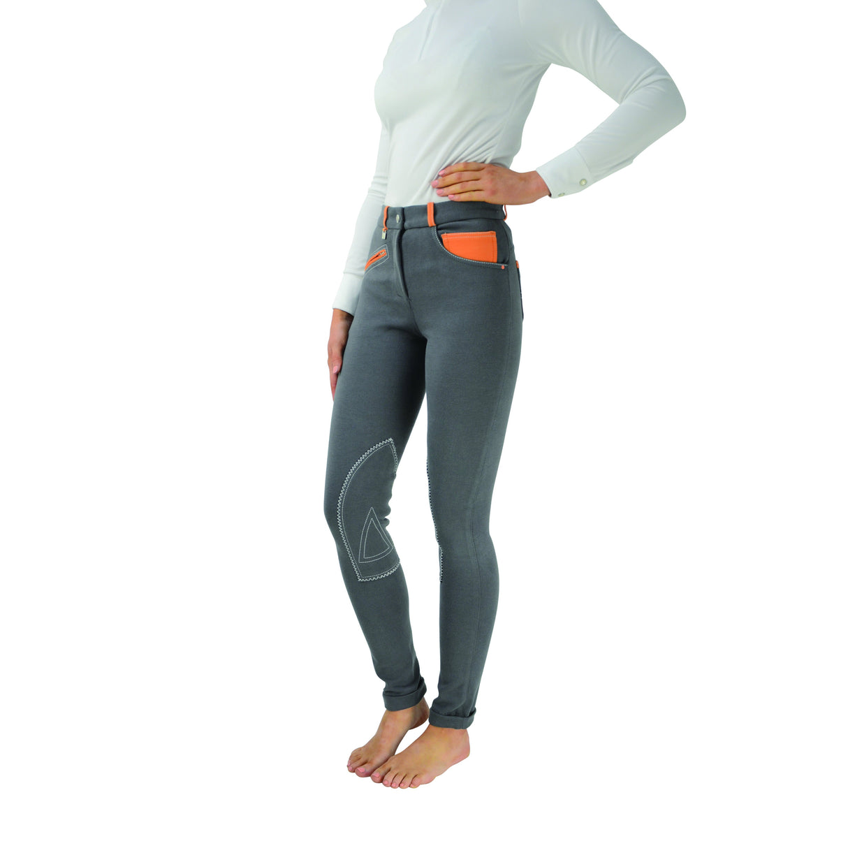 A fashionable jodhpur which gives the look of wearing jeans. A flattering contrast stitch and colour contrast pockets belt loops and zip detailing make this a must have product. Machine washable at 40C. Leg length: Regular.