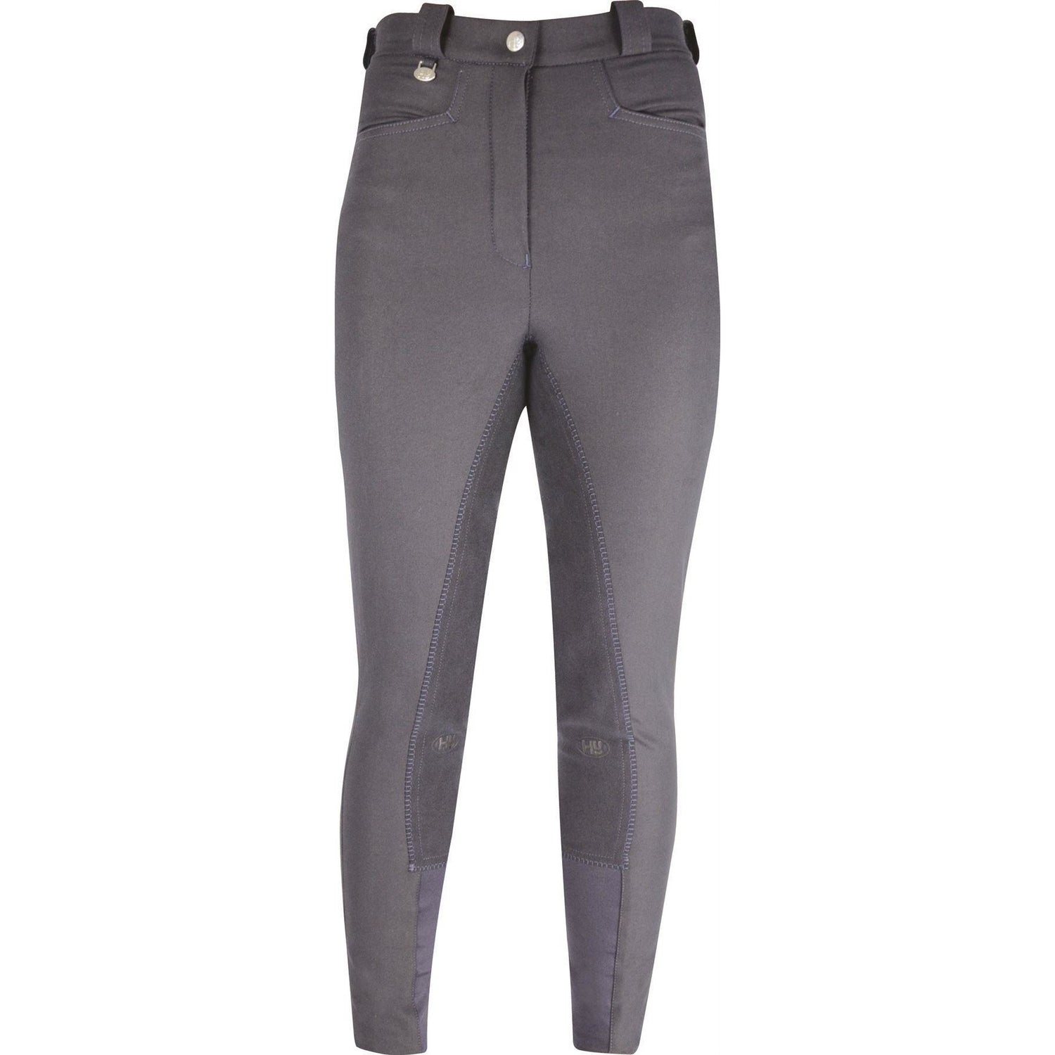 An ideal choice for the competitive rider these breeches are water repellent and breathable and designed with 4 way Bi-stretch to aid movement. They are fashionably styled with two plain side pockets and a back pocket with the Hy emblem in silver on the right pocket. Featuring a cleverly designed lower leg of half base material and half polyester for ease of use getting on and off and for fit and comfort inside your boots. A lightweight choice with an Alos soft stretch leather full seat. Machine washable.