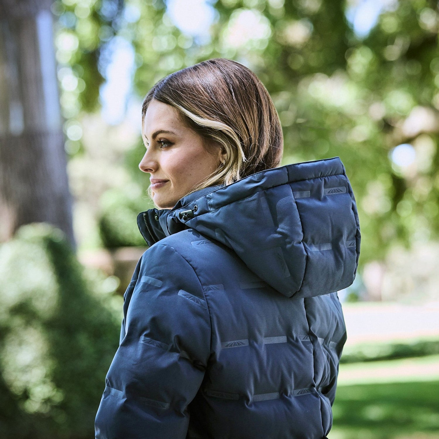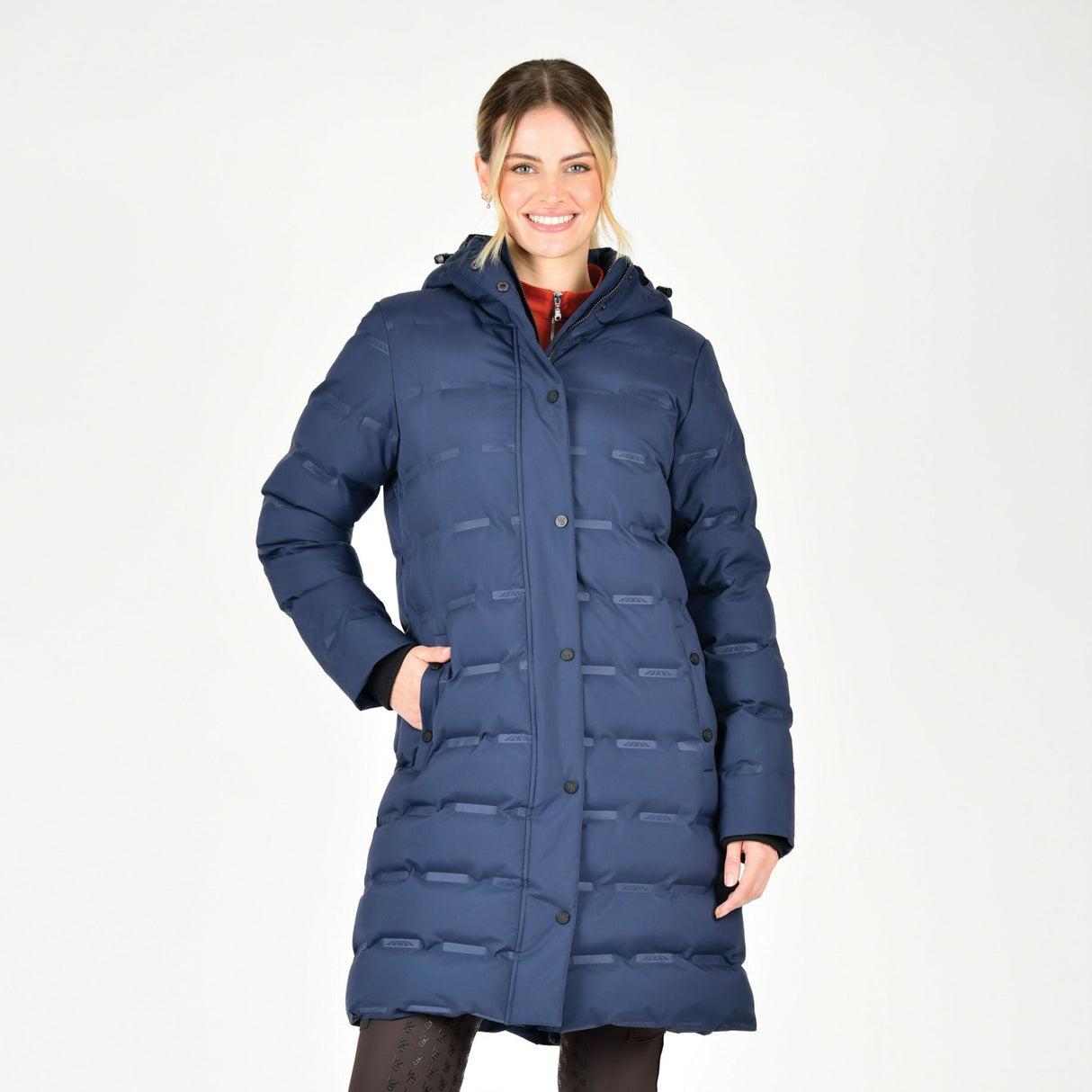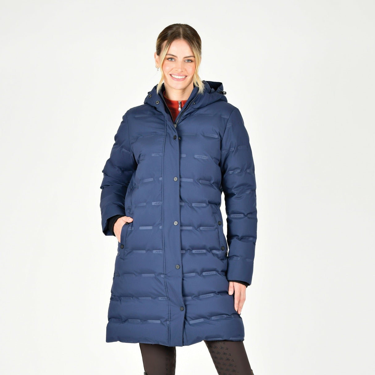 Seal in the warmth with the stylish WeatherBeeta Helsinki Heat Seal Quilted Jacket! Designed with comfort in mind this long line winter coat is sure to keep you warm at the yard this winter. The showerproof outer will protect you in the unexpected showers, whilst the heat seal quilted design remains stylish, ribbed storm cuffs and wadding fill add extra protection keeping you cosy all day long. Featuring a removable hood, with toggles and drawcord, for versatility. Two side pockets with press stud closure are ideal for keeping your hands warm when teaching! With a two way front zip closure and rear gusset with press stud closure allow for freedom of movement when walking or in the saddle. This winter coat comes in Navy and available in Ladies XS - XL.