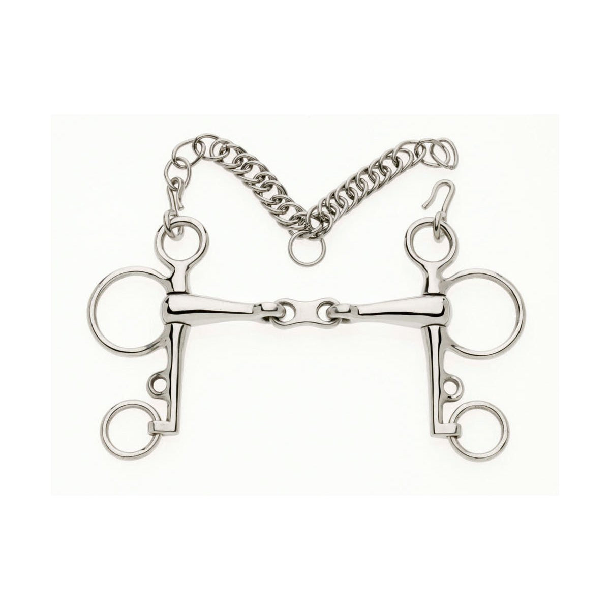 French link mouthpiece relives the nutcracker action and prevents palate pressure. Ideally used with two reins, but one rein can be used if roundings are used.