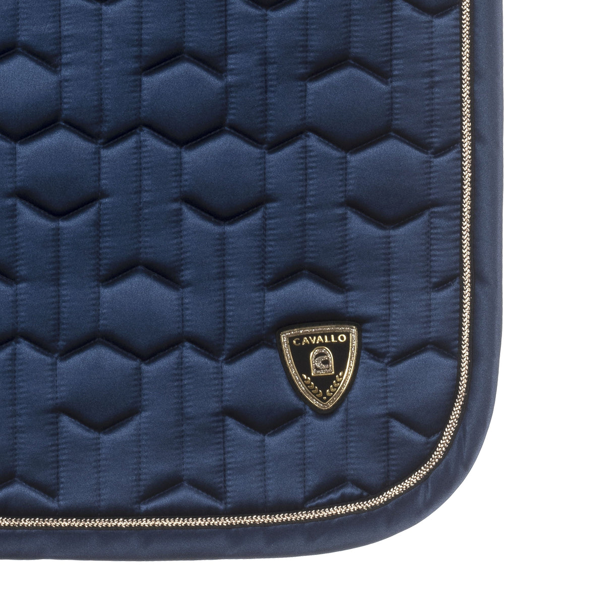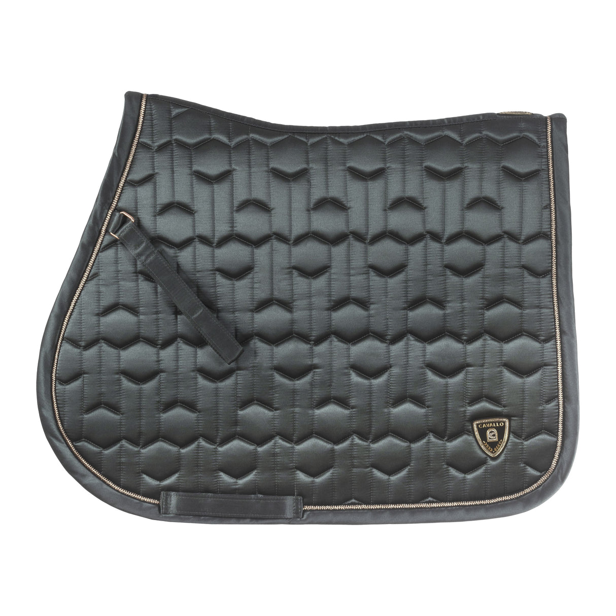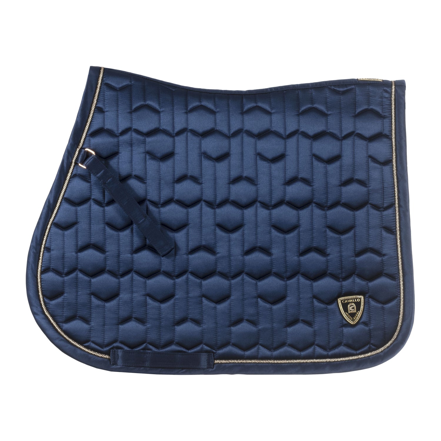 The Cavallo Jette Cooling Yard Saddlecloth features a unique design with intricate quilting and a sleek appearance. The saddle pad is accented with a gold-coloured band and black contrast edging, and is adorned with a high-quality gold-coloured Cavallo logo patch at the rear corners.