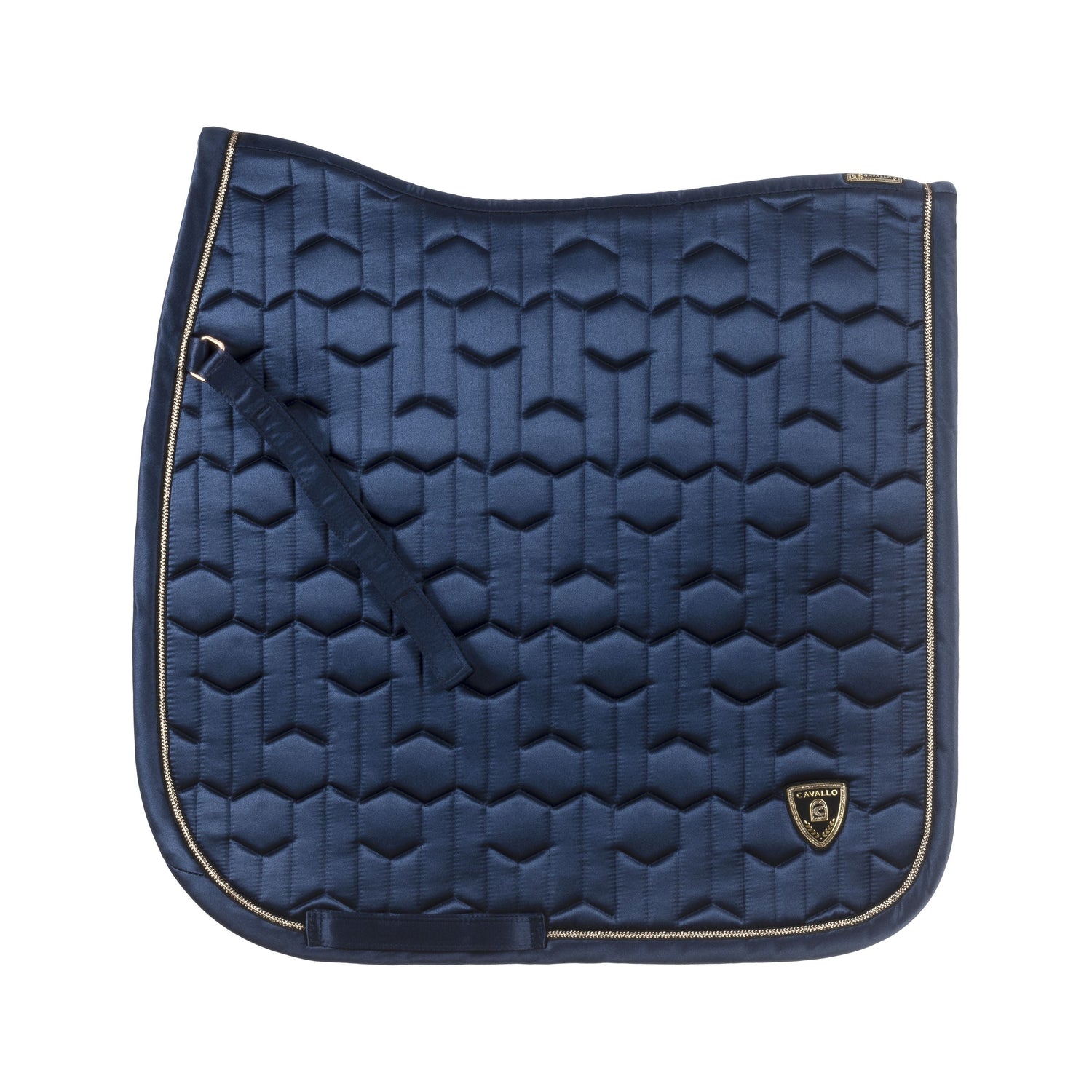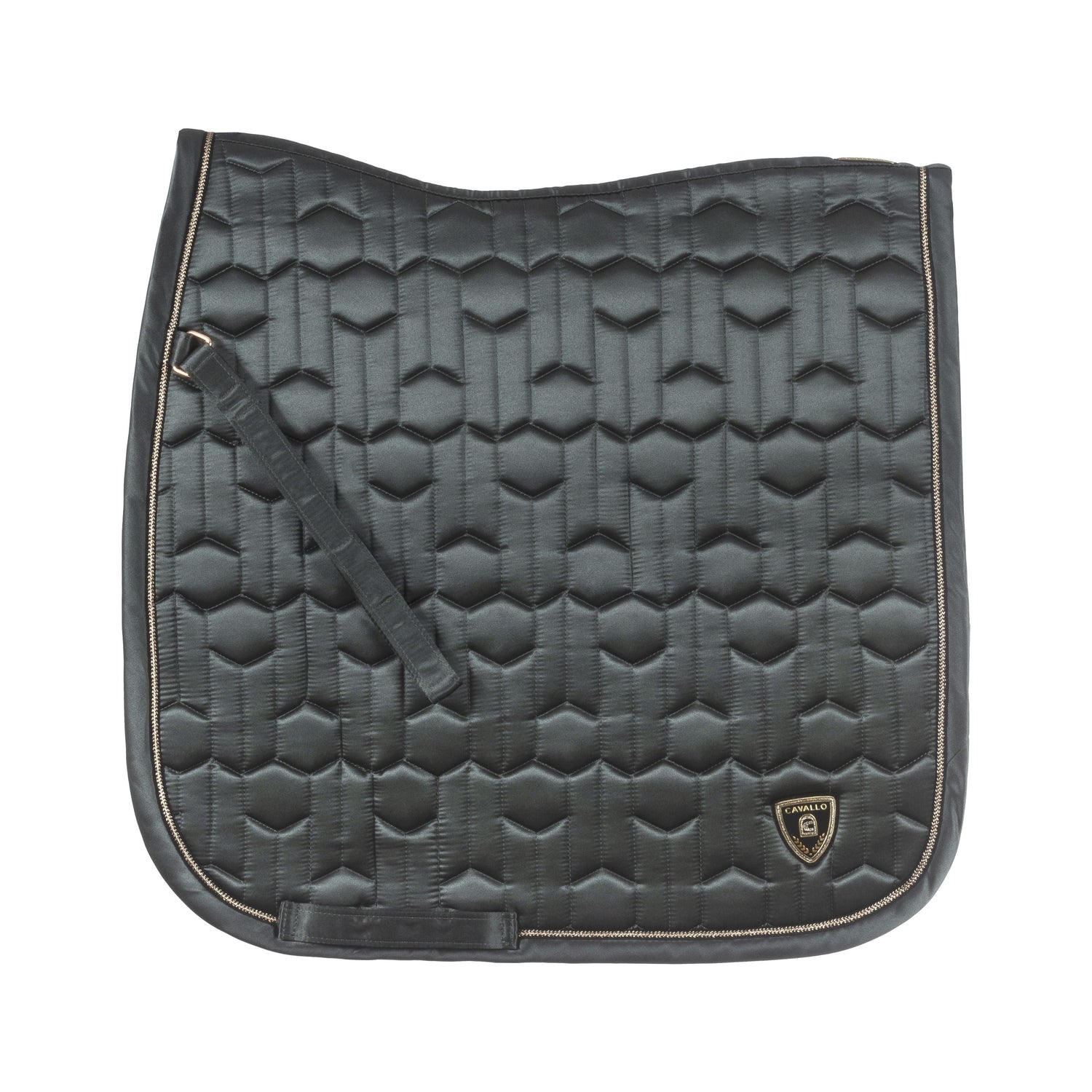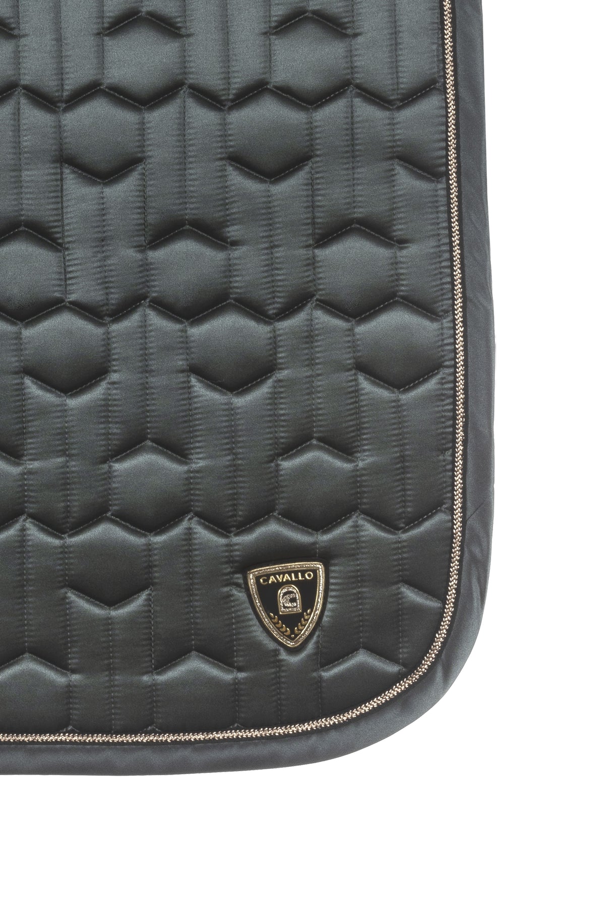 The Cavallo Jette Cooling Yard Saddlecloth features a unique design with intricate quilting and a sleek appearance. The saddle pad is accented with a gold-coloured band and black contrast edging, and is adorned with a high-quality gold-coloured Cavallo logo patch at the rear corners.