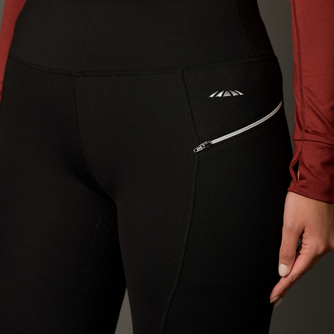 These elegant panelled tights with full silicone gel seat for rider stability offer zip pockets at the high hip with a fitted stretch waistband for a smooth hugging fit.