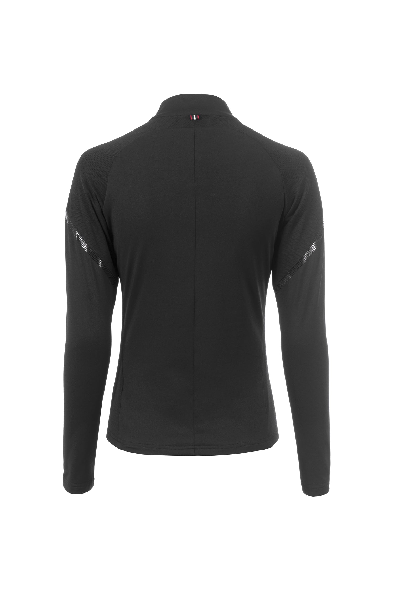 The Cavallo Milla Shirt combines a hybrid stand-up collar design with bi-elastic functional material and tonal mesh inserts in black. It features a short zip with Cavallo print on the front of the collar and a decorative zip pendant with a crystal stone. The inside is slightly brushed for a cosy feeling and the raglan sleeves have a black glittering stripe artwork on the upper arm. The left chest showcases the Cavallo stirrup artwork while the upper arms and sides of the torso have tonal mesh inserts.