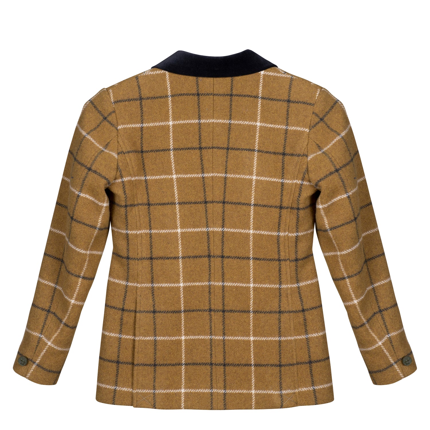 Eine traditionelle, klassische Turnierjacke mit frischer, moderner Passform aus Wollmix-Tweed-Karomuster. Stildetail: auf Schmeichelei zugeschnitten, Kragen und Taschen mit Samtbesatz, doppelte Schlitze hinten, Details mit Pferdeknöpfen, zwei Pattentaschen, Futter mit Fasanenmuster, Marke Aubrion. Doppelter Verschluss für Jungen oder Mädchen.