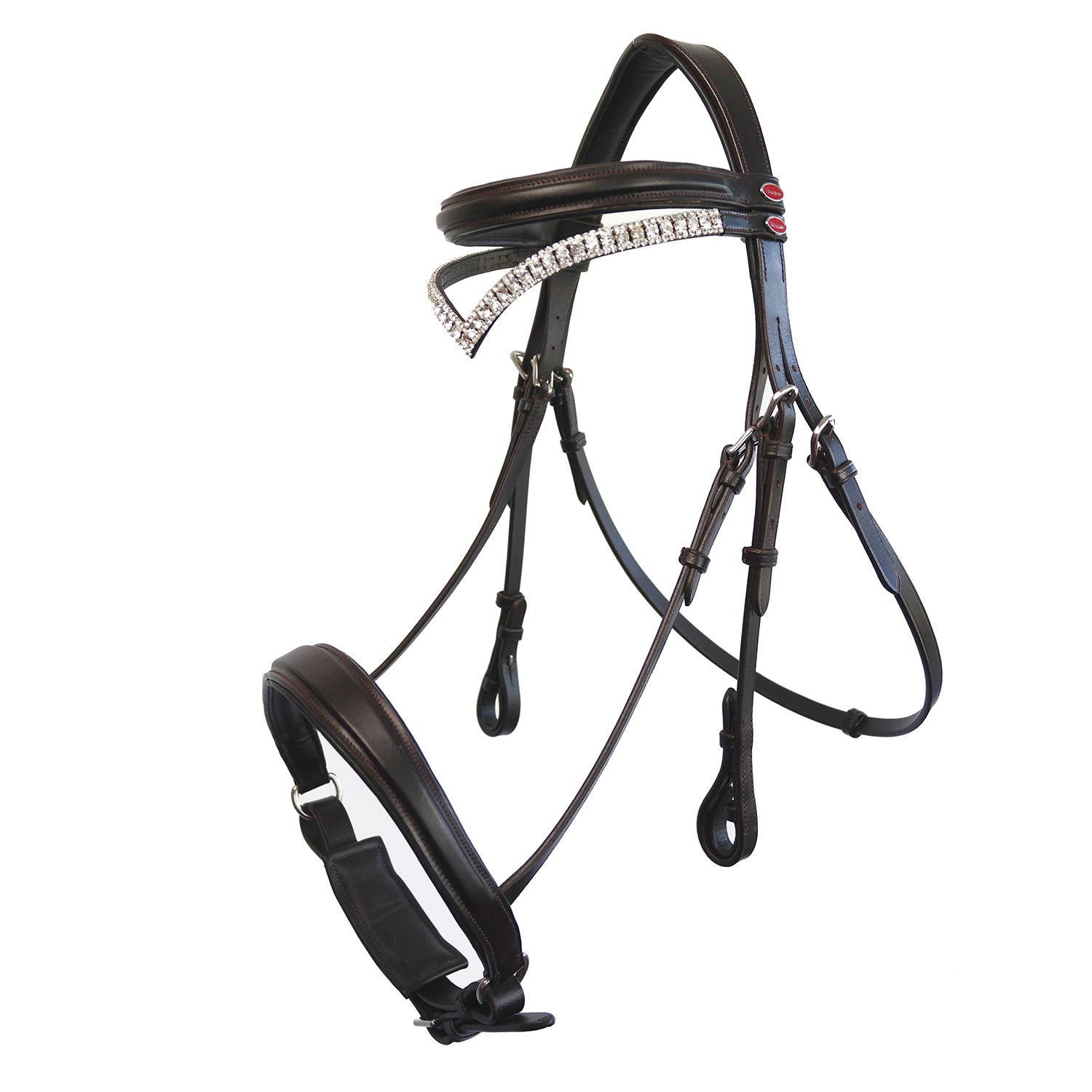 Wird mit einem erhöhten Stirnband für den Alltag und einem juwelenbesetzten Stirnband mit Diamanten geliefert – perfekt für Shows! Zügel separat erhältlich. Das geschmeidige Leder hat ein natürliches Finish und das Stirnband und der Nasenriemen sind durchgehend mit farblich abgestimmten Nähten versehen.
