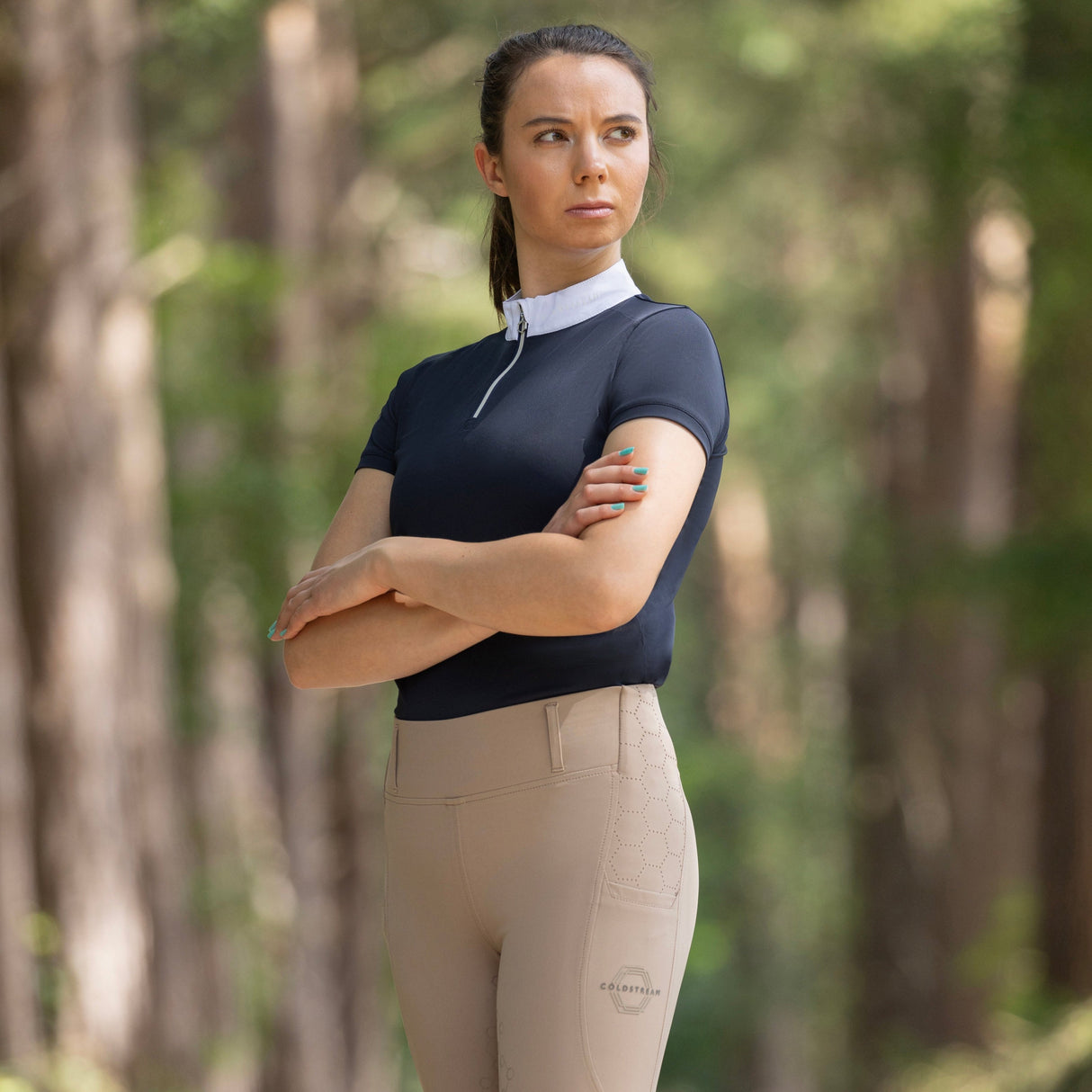 The premium textile is contrived from recycled plastic bottles and offers a 50+UV block from the suns powerful rays making the shirt a must-have for competing in hot climates. Raised silicone carefully placed around the collar adds subtle branding along with the silver zip pull is in the iconic Coldstream hexagon shape. Sculpted for a feminine fit whilst simultaneously offering complete range of movement an essential for competition days.