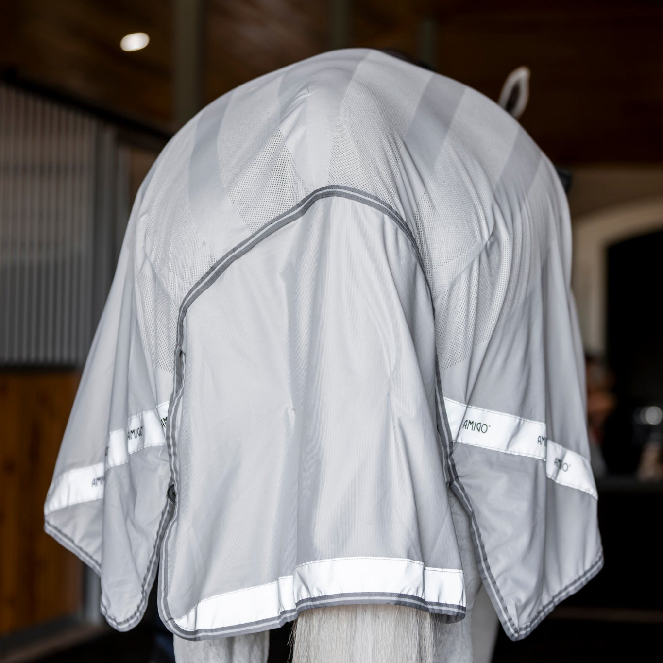 • Abnehmbare, leicht zu öffnende große Kapuze zum Schutz von Nacken und Schultern des Pferdes, Schlaufe zur Befestigung am Zaumzeug während des Trainings, reflektierende Sicherheitsstreifen.