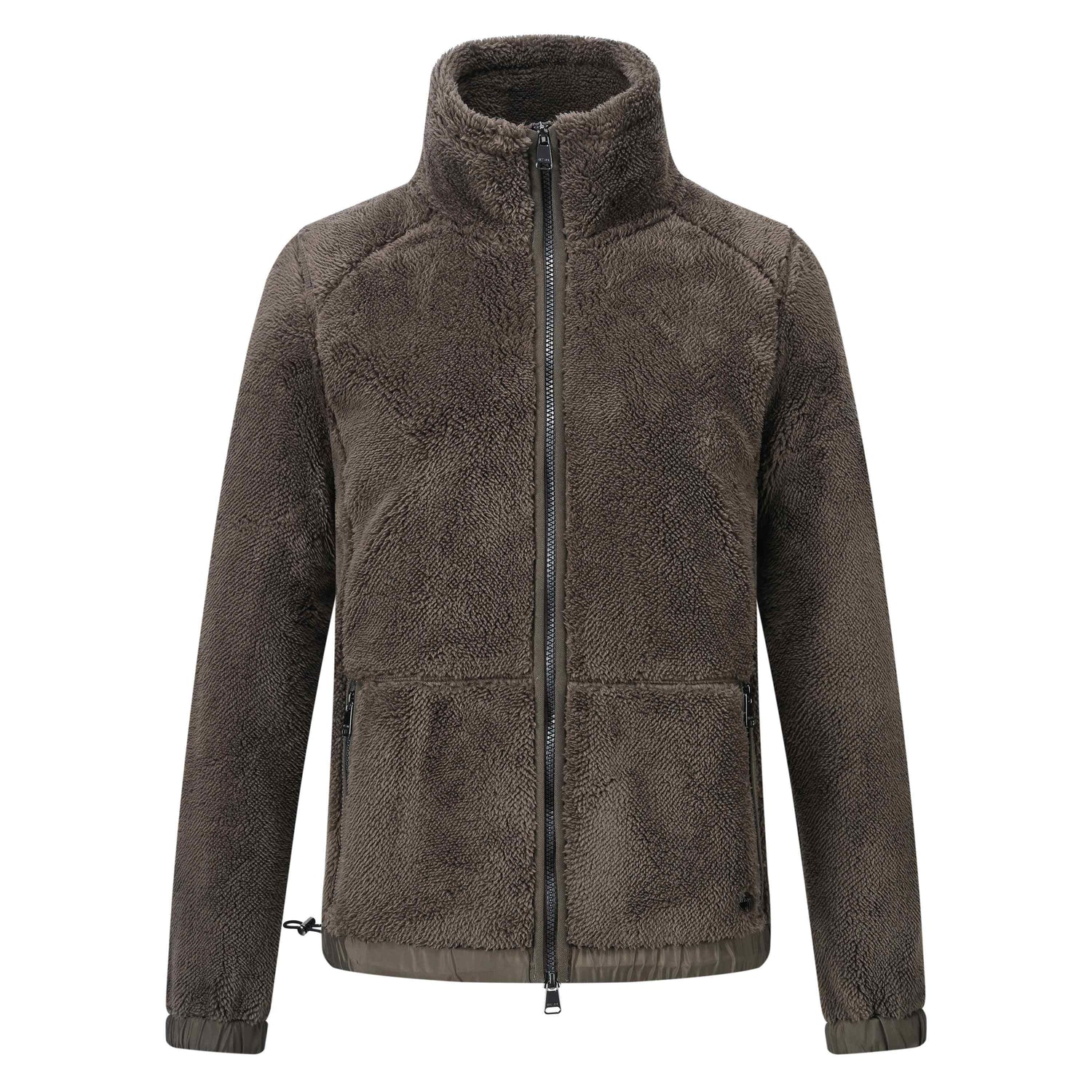 The elastic in woven fabric used for cuffs and hem ensures a secure fit, while the zip at the center front makes for easy closure. Functional details continue with pockets that have zip closures, and a fancy overlock stitch can be seen on the seams. The branded pullers and metal coin at the bottom, on the wearer's left, add a touch of sophistication. The black metallic accessories complete the look.