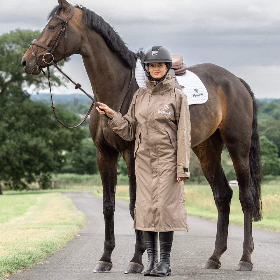Stay dry, warm, and ready for anything in the EQUIDRY Evolution. Designed to be oversized and worn full length, this performance coat boasts a remarkable 20,000mm waterproof rating, is fully breathable, mesh-lined, and layer-friendly — even fitting over a body protector. Features include riding side zips that hold the coat securely in place and reveal hidden storm skirts that flare out in the saddle for enhanced leg coverage, along with adjustable cuffs, multiple pockets, and internal embroidery access.
