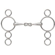 Le lien français dans ce morceau signifie que la pression est appliquée des deux côtés de la langue. Certains chevaux au palais bas peuvent trouver ce mors plus confortable car l'embout buccal ne doit pas entrer en contact avec le palais lorsque le mors est en action. Les trois anneaux offrent des options de levier pour augmenter la gravité.