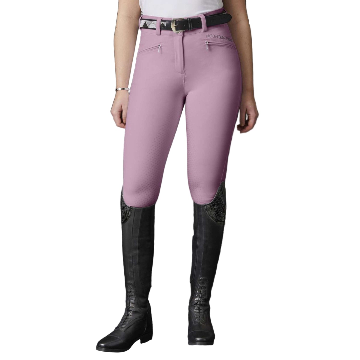 The Mountain Horse Diana Breeches feature a high waist and full seat silicone grip, along with front pockets and a flexible cuff at the bottom. These breeches are made with high-quality breathable fabric that is moisture-wicking and resistant to dirt and liquid. The waistband has a double hook and loop closure and soft logo elastic on the inside, while the leg opening has a flexible double folded cuff.
