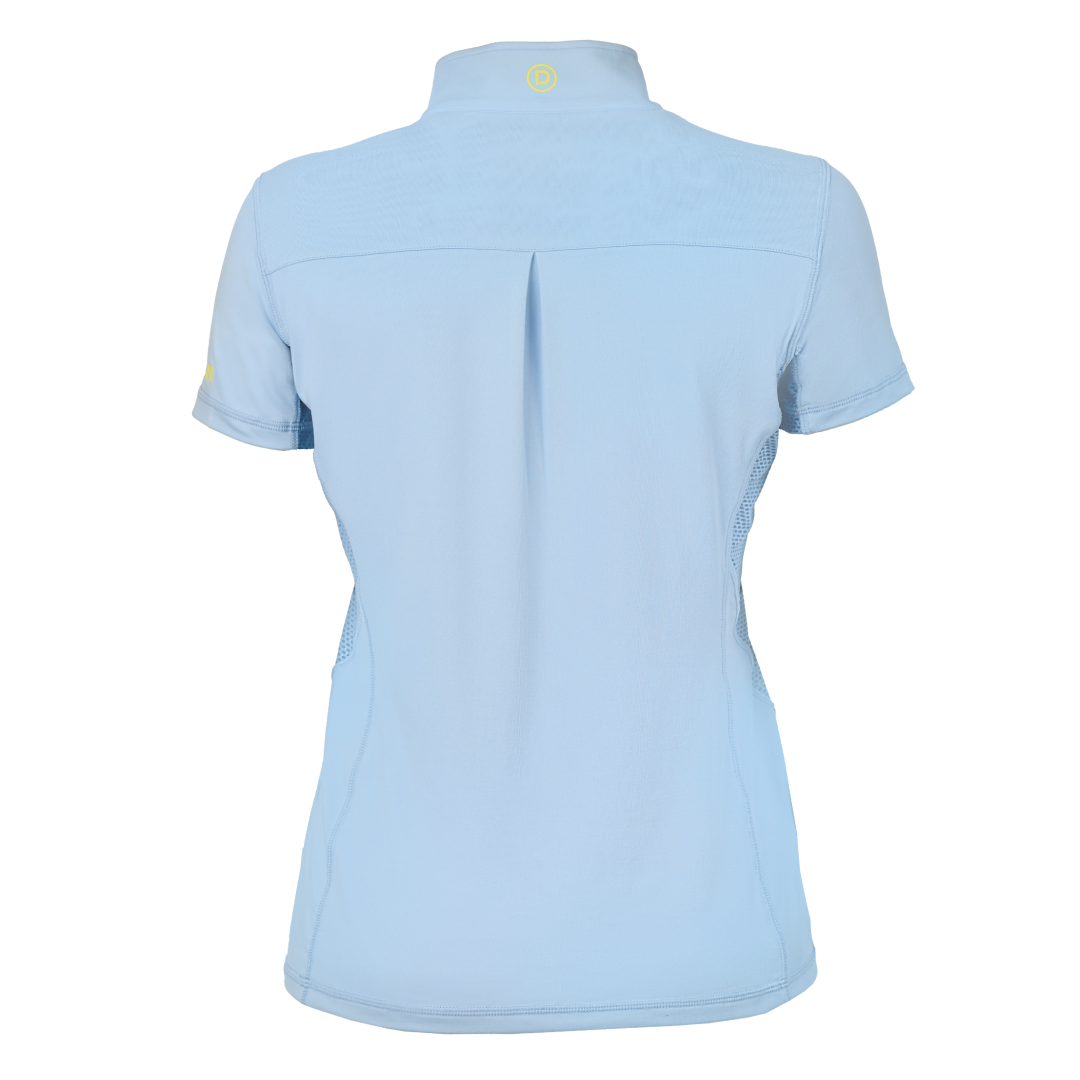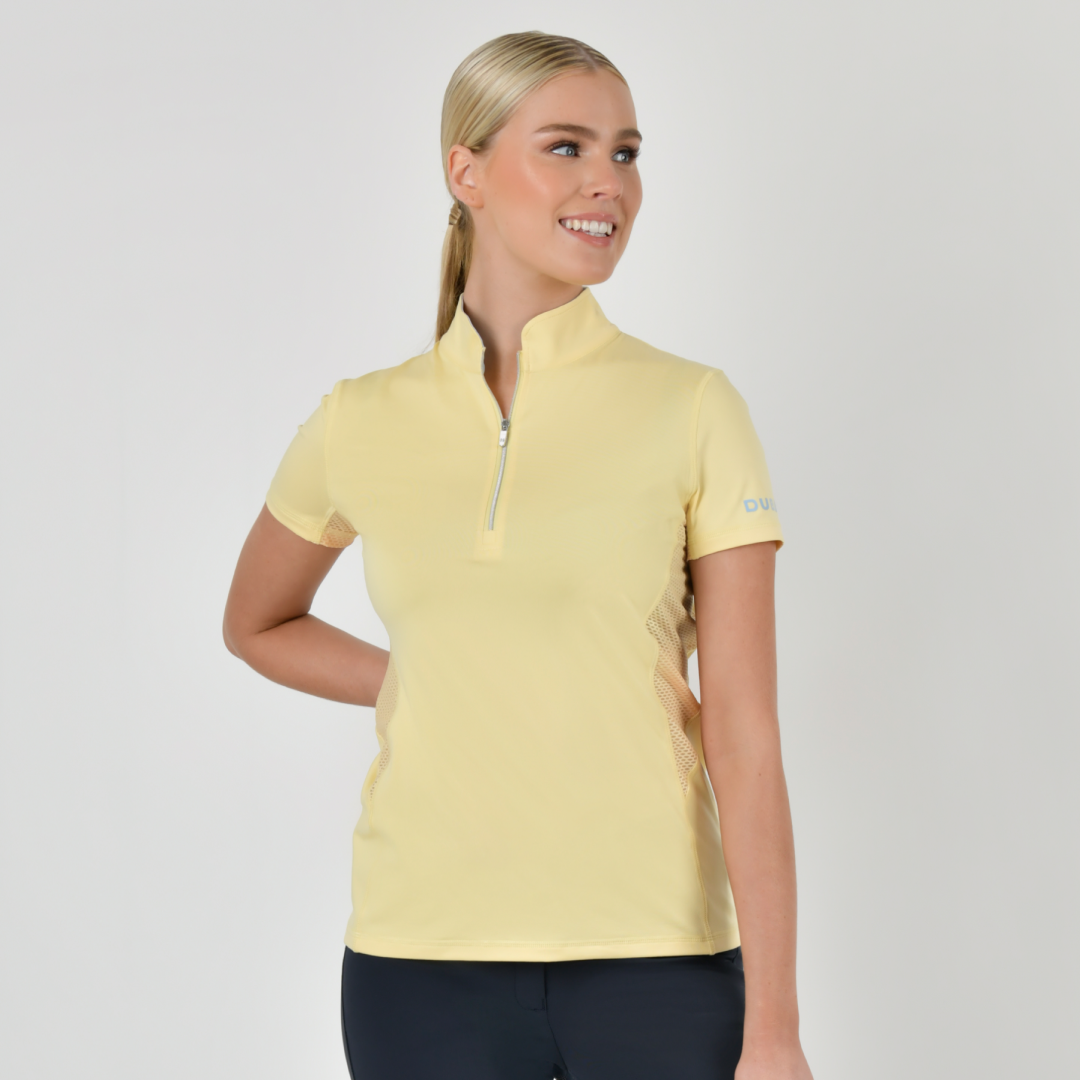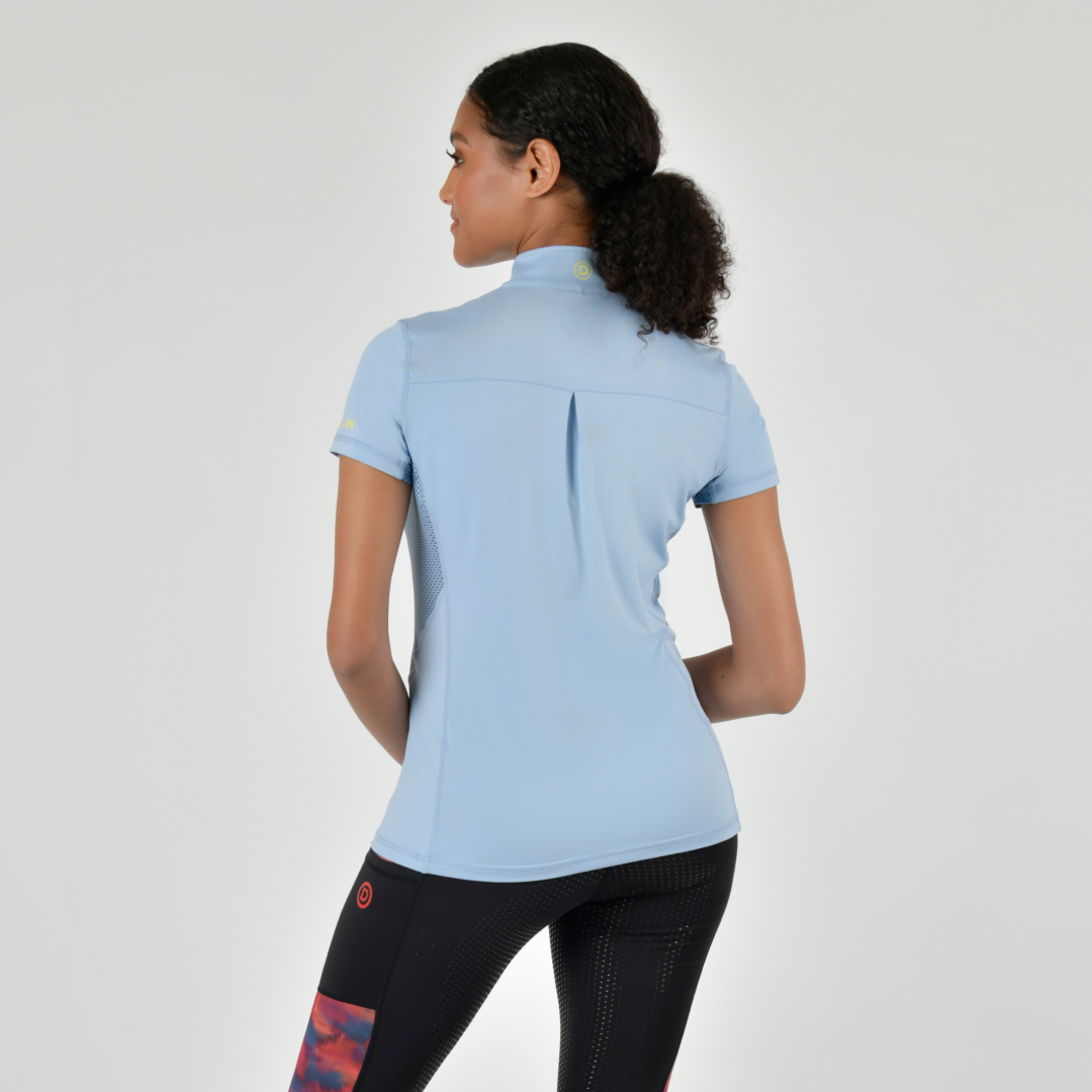 Doté de la technologie Comfort Dry qui fonctionnera pour vous quelle que soit la météo, offrant un contrôle de l'humidité pour un confort toute la journée. Panneaux latéraux en mesh, sous les manches et empiècement dos. L'extérieur couleur pêche élimine la saleté, le foin et les crins de cheval, pour vous donner une apparence élégante. Un col montant avec une demi-patte zippée, dans un style semi-ajusté pour offrir un ajustement confortable.