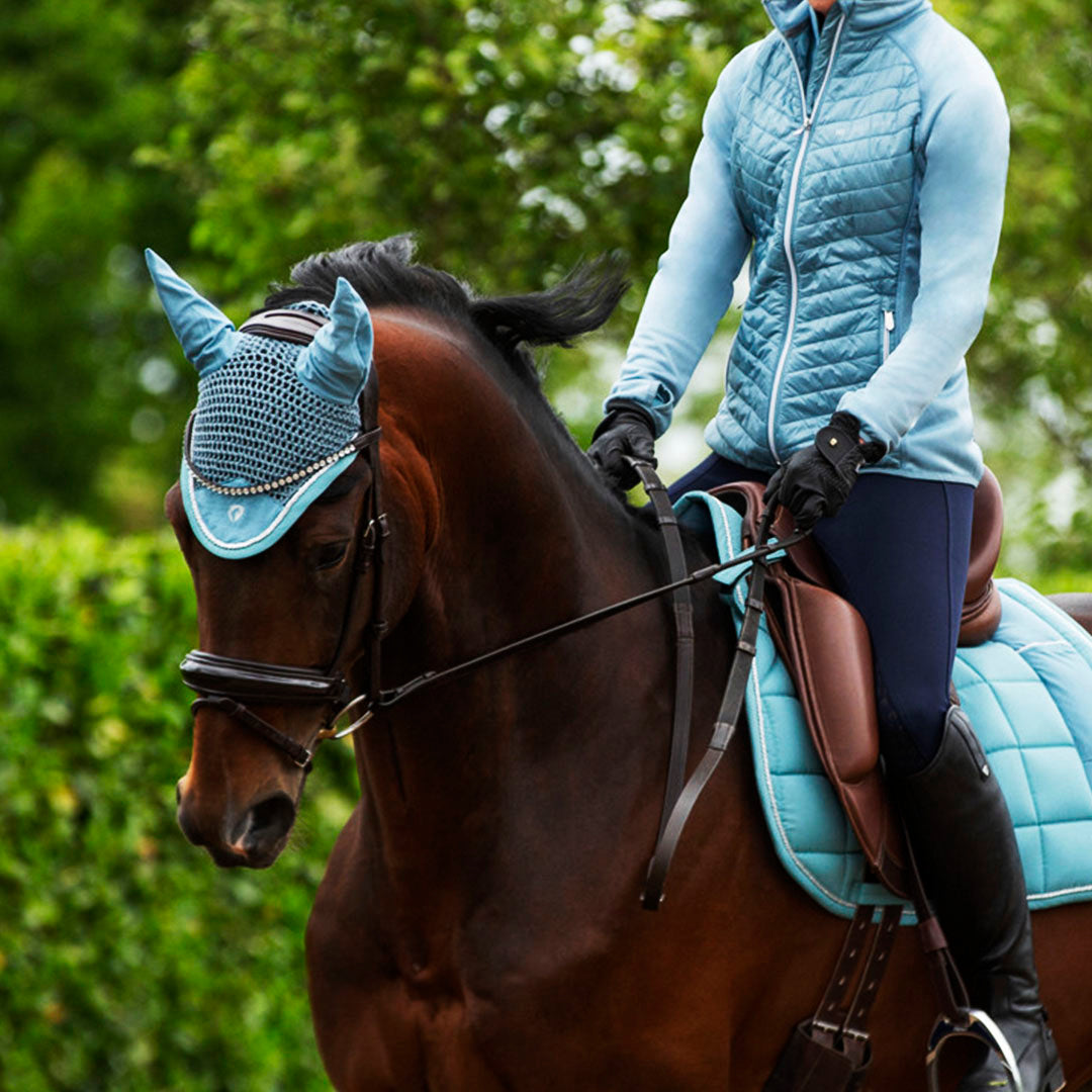 Le voile anti-mouches Hy Equestrian Synergy est magnifiquement conçu avec un tissu au crochet léger et serré, qui a été complété par un panneau en maille, ainsi que des oreilles en maille respirante pour permettre à votre cheval de rester au frais pendant toute activité.