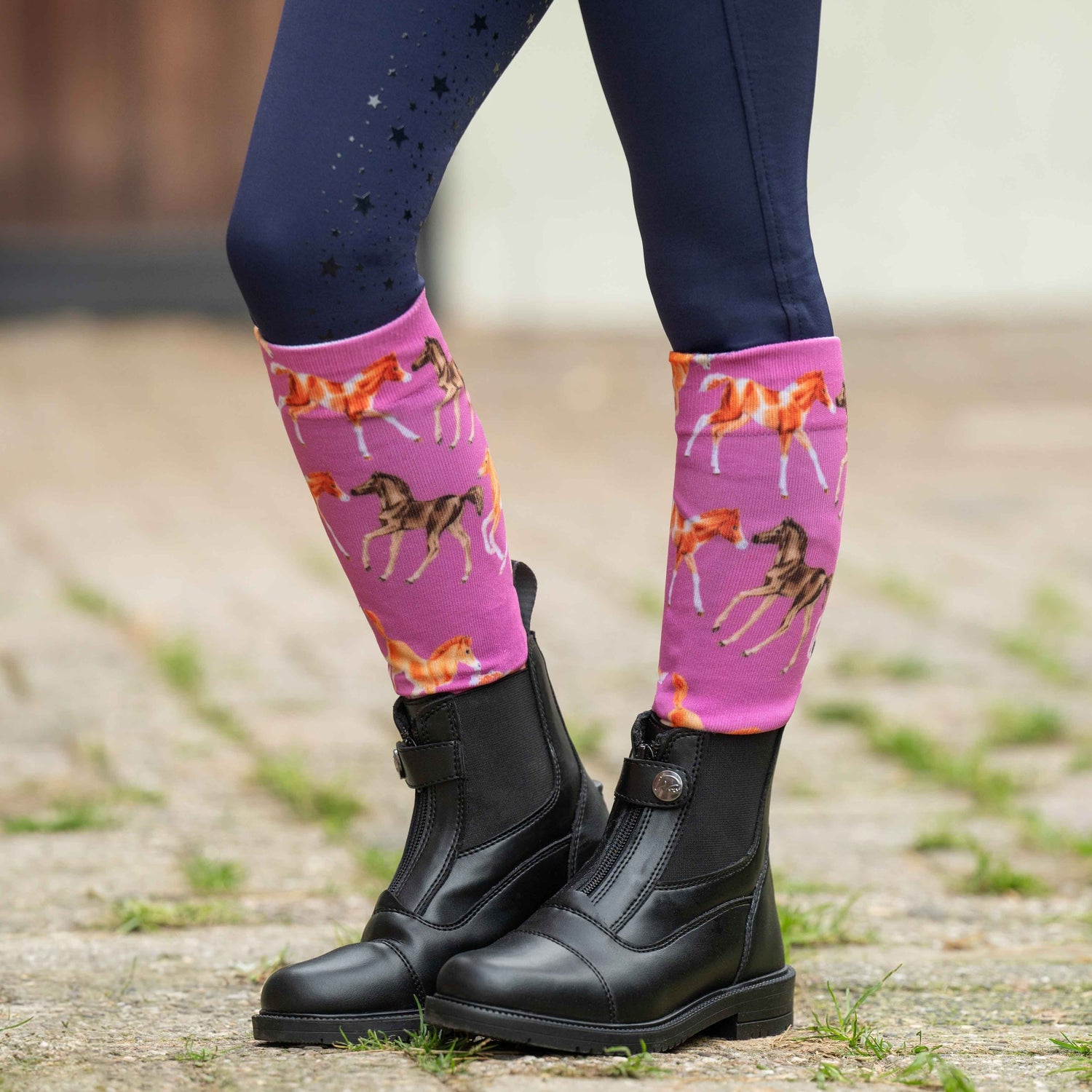 The riding socks Pony Club are the perfect companion for little horse fans. The cute horse motif print with cute foals makes them a real eye-catcher. Thanks to their lightweight material, they are ideal for summer and are comfortable to wear. The comfortable waistband keeps the socks securely in place so that they don't slip - whether in riding boots or casual shoes.