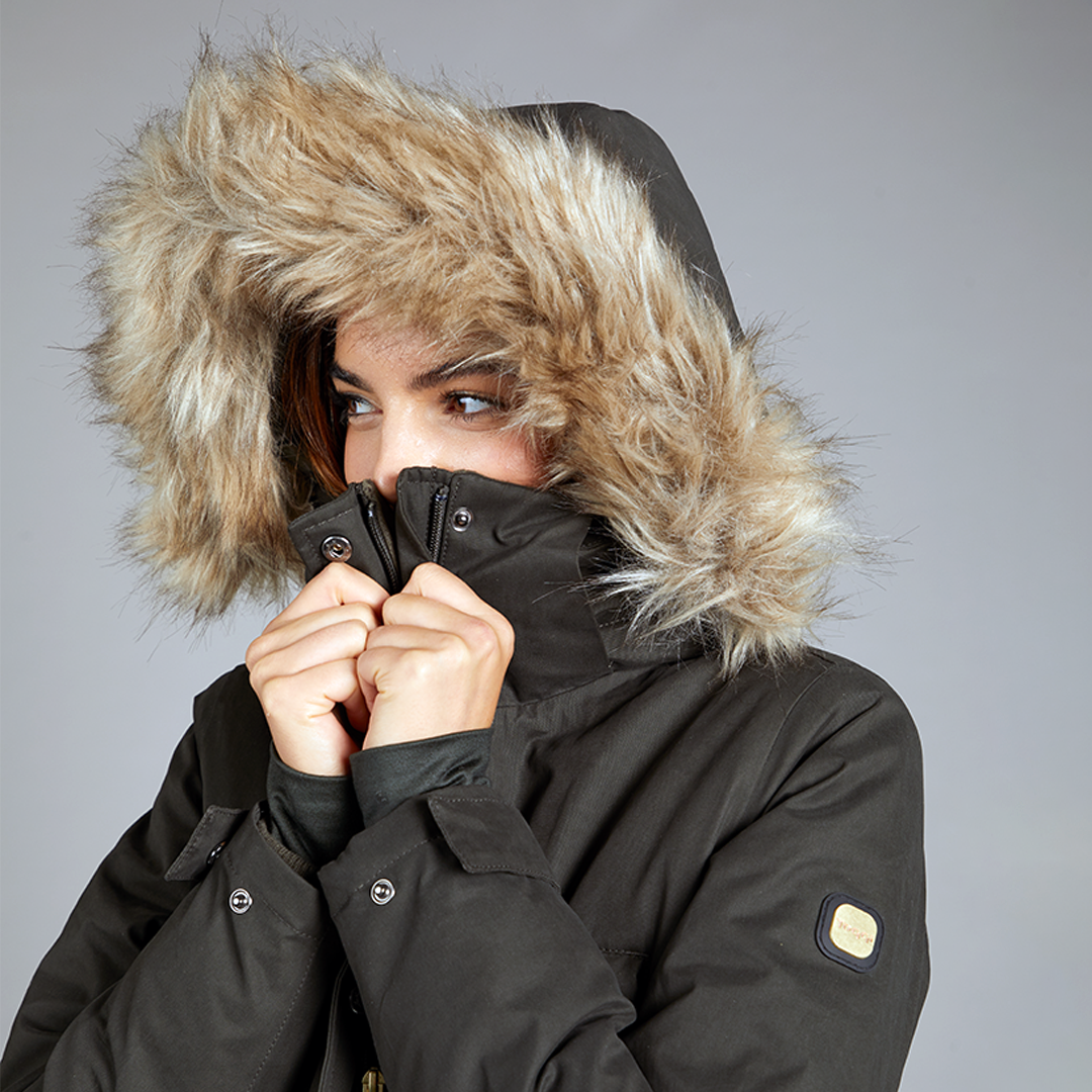other outdoor pursuits, this style features handy chest and hip pockets, an inner drawcord at the waist, storm cuffs, a faux fur trimmed, removable hood and branded gold trims.