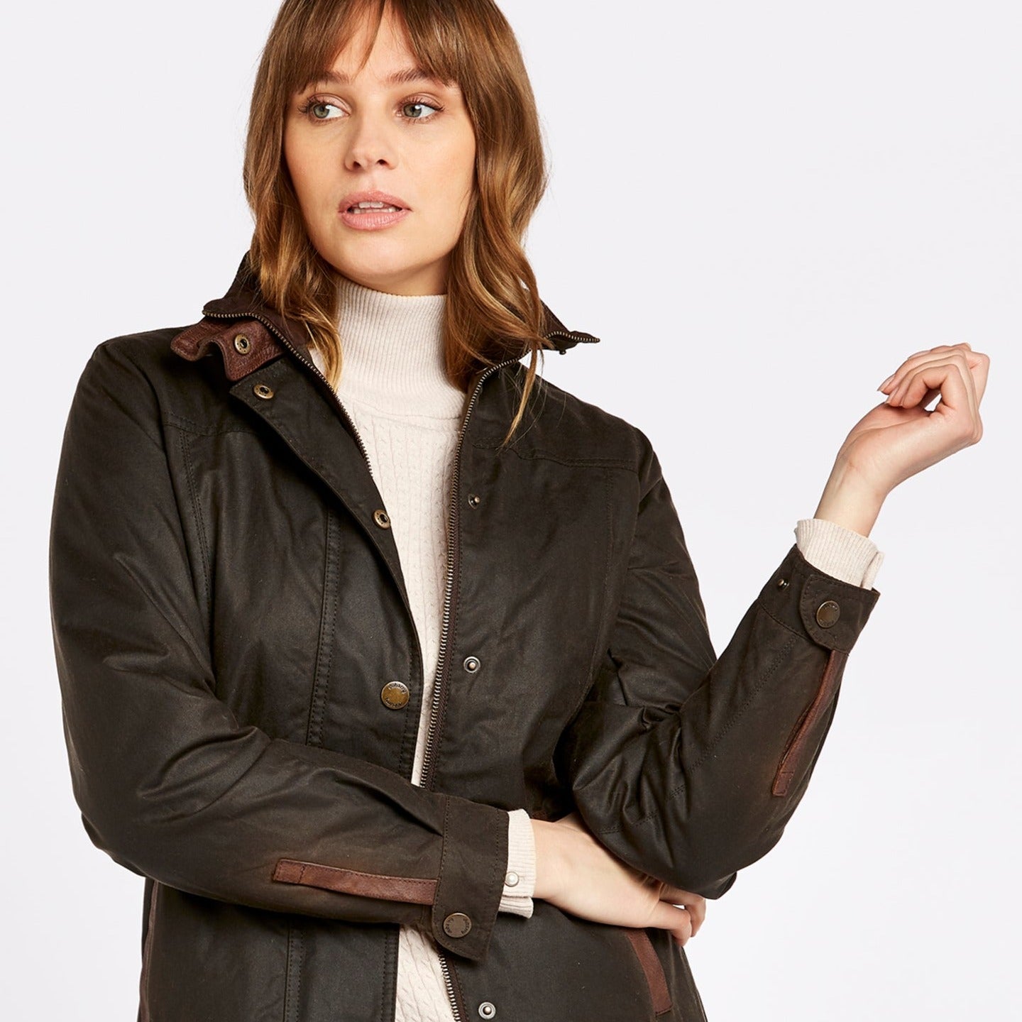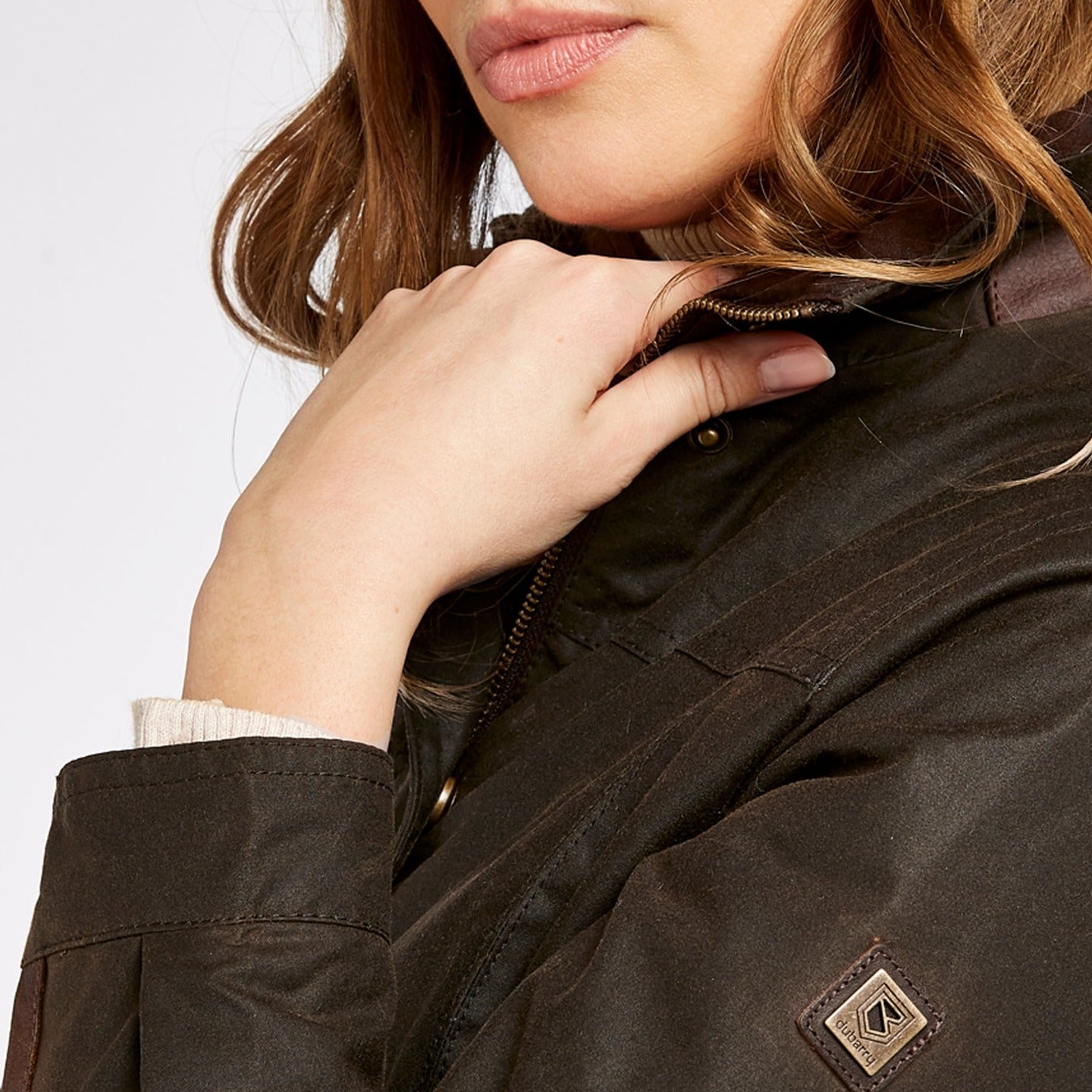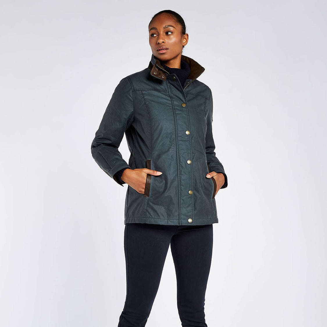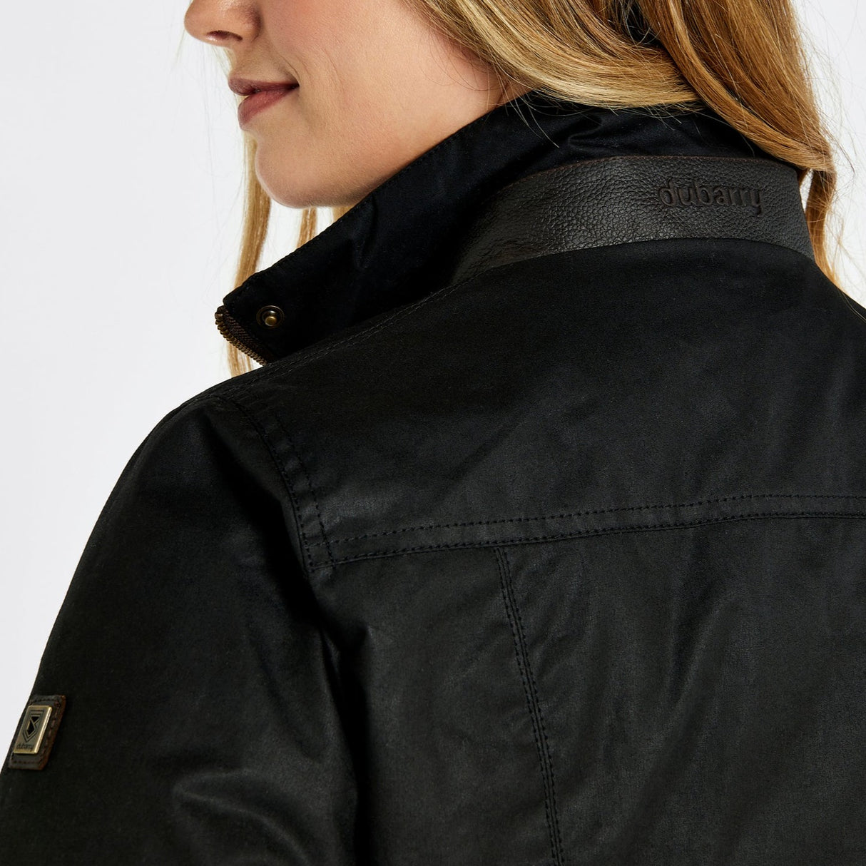 The waxed cotton Dubarry Mountrath is a warm winter jacket with PrimaLoft fill and water repellent finish - perfect for braving wet and windy days in. The leather trim and branded stud poppers lean into a traditional, elegant aesthetic while the stud-fastened faux suede collar and soft, flattering tailoring add a slick urban flair to this comfortable country style.
