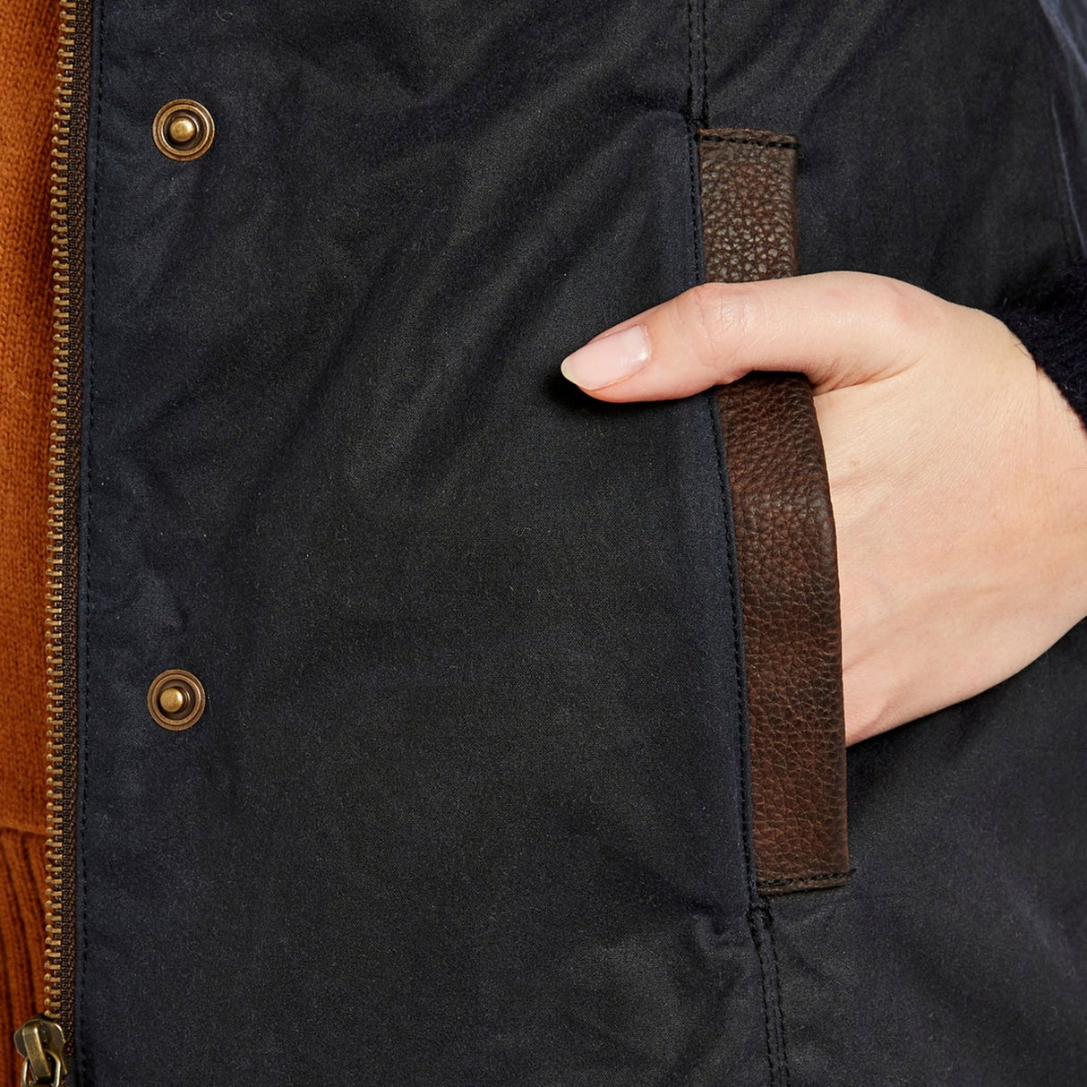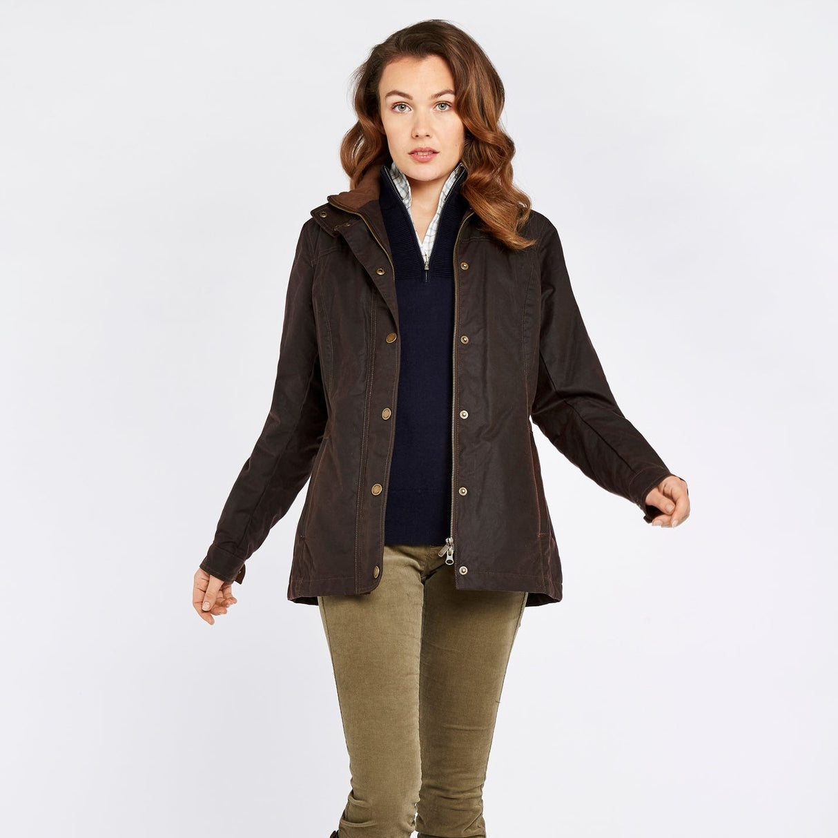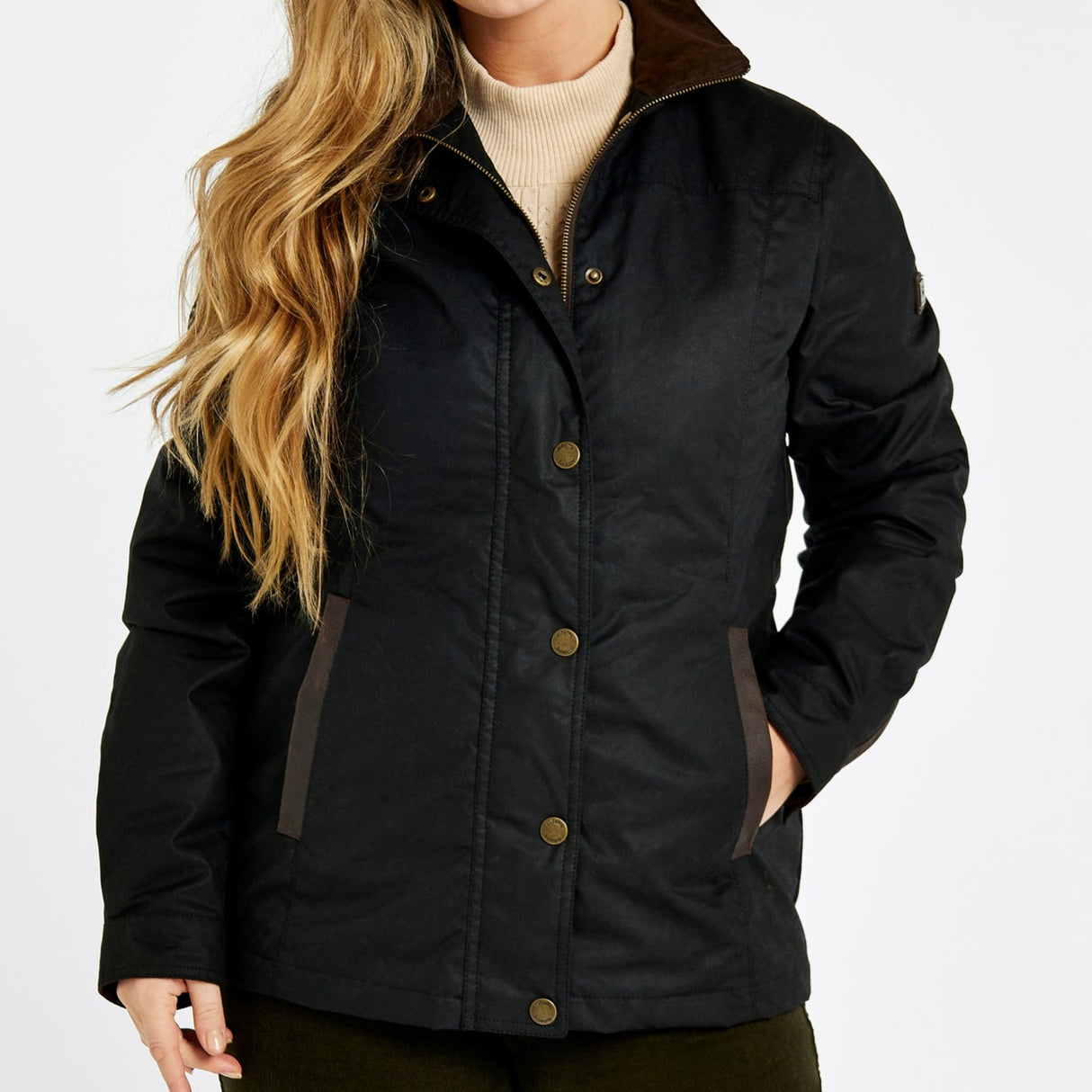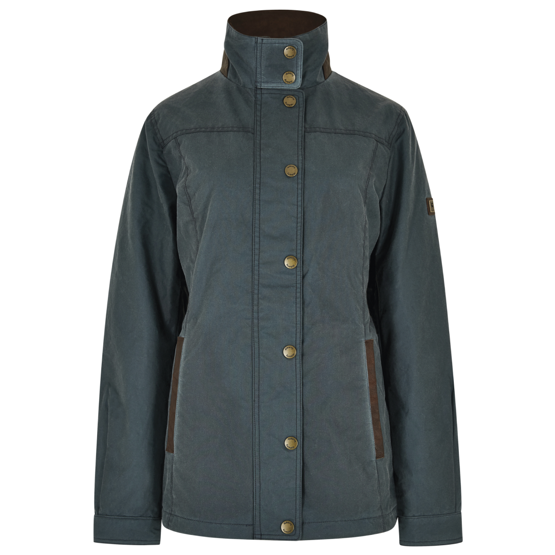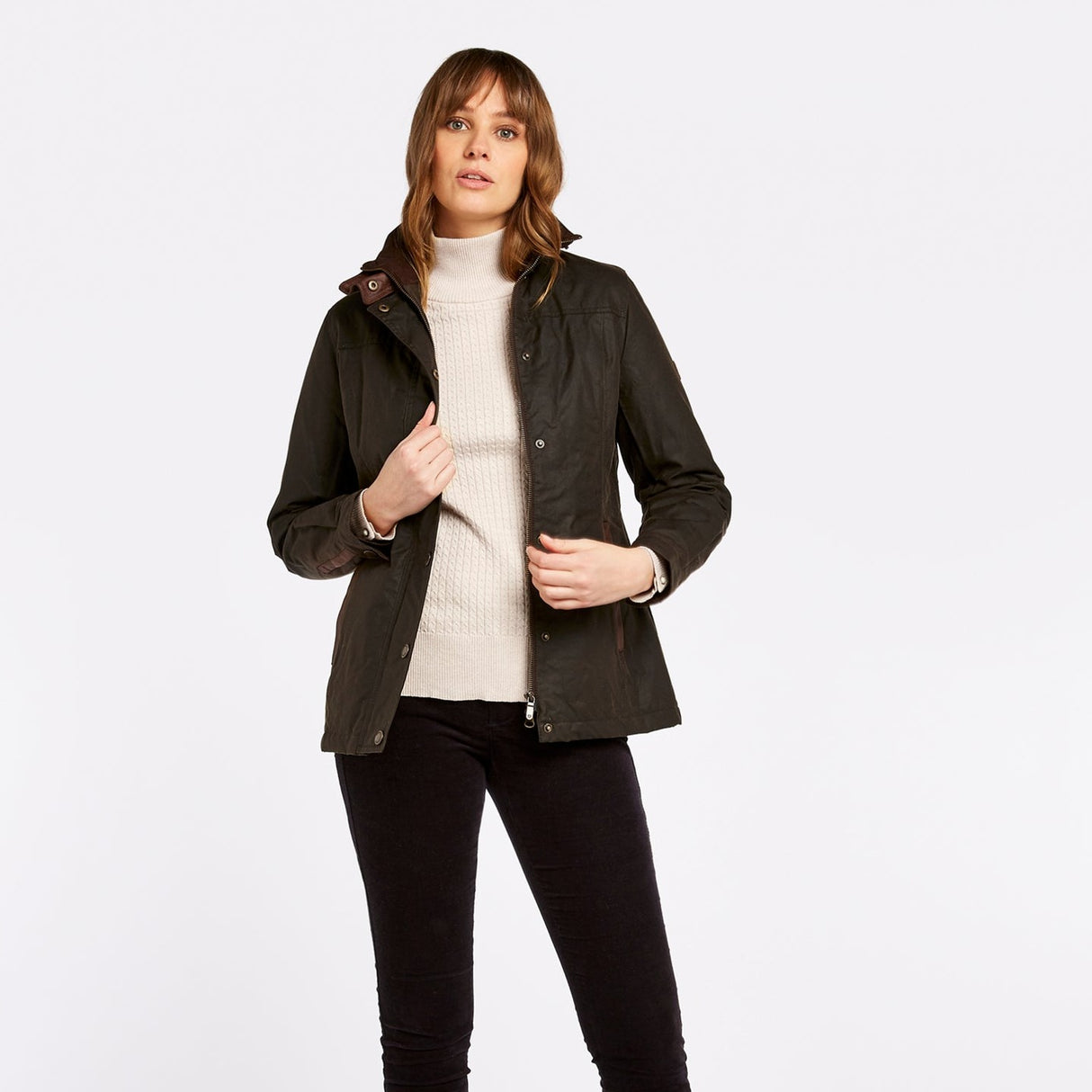 The waxed cotton Dubarry Mountrath is a warm winter jacket with PrimaLoft fill and water repellent finish - perfect for braving wet and windy days in. The leather trim and branded stud poppers lean into a traditional, elegant aesthetic while the stud-fastened faux suede collar and soft, flattering tailoring add a slick urban flair to this comfortable country style.