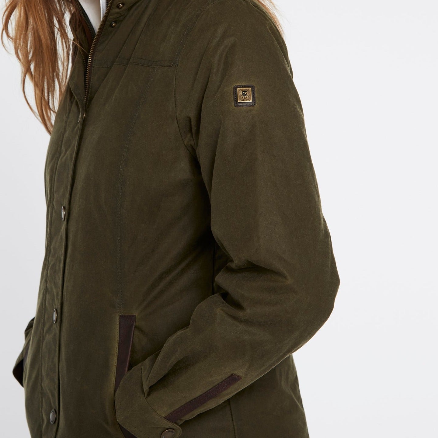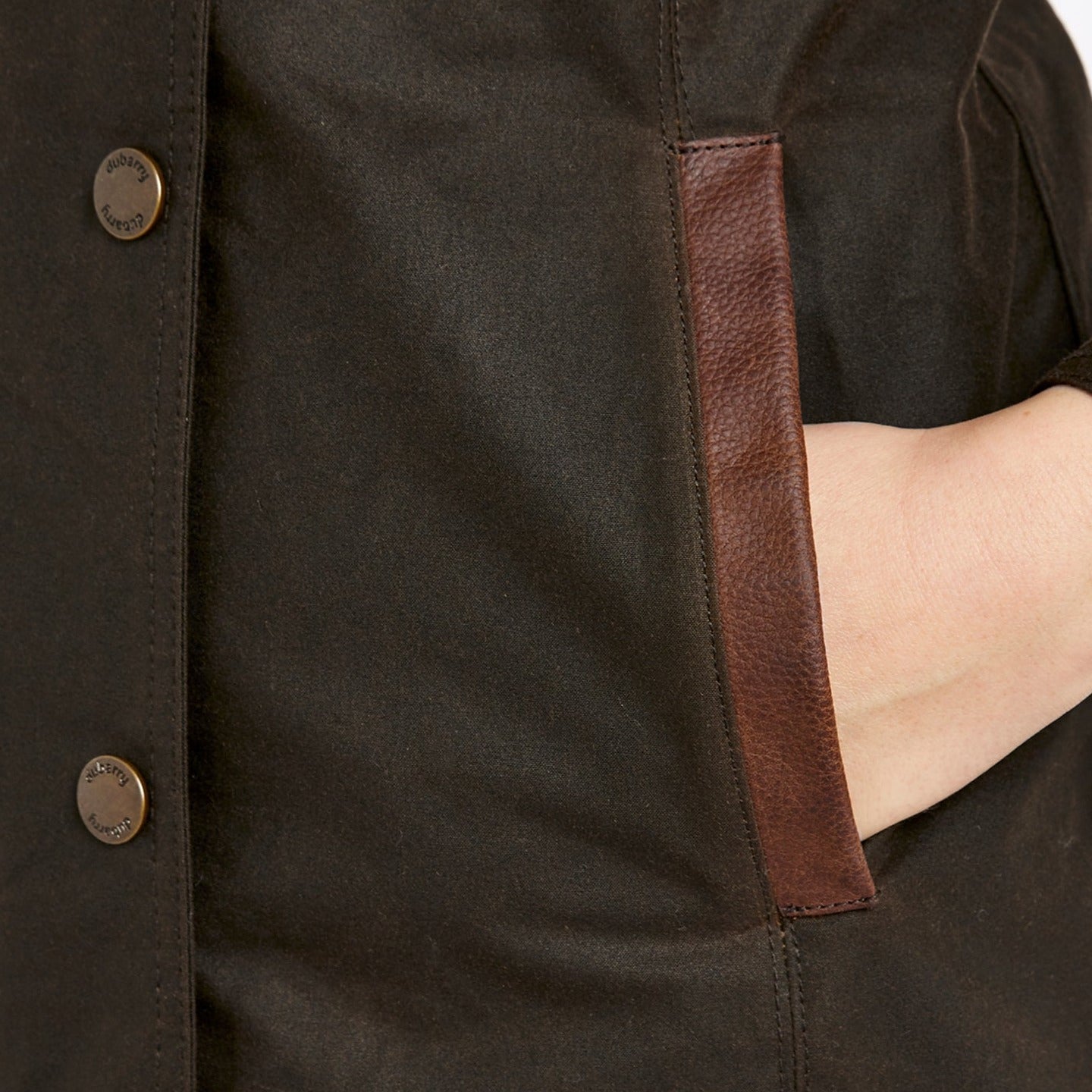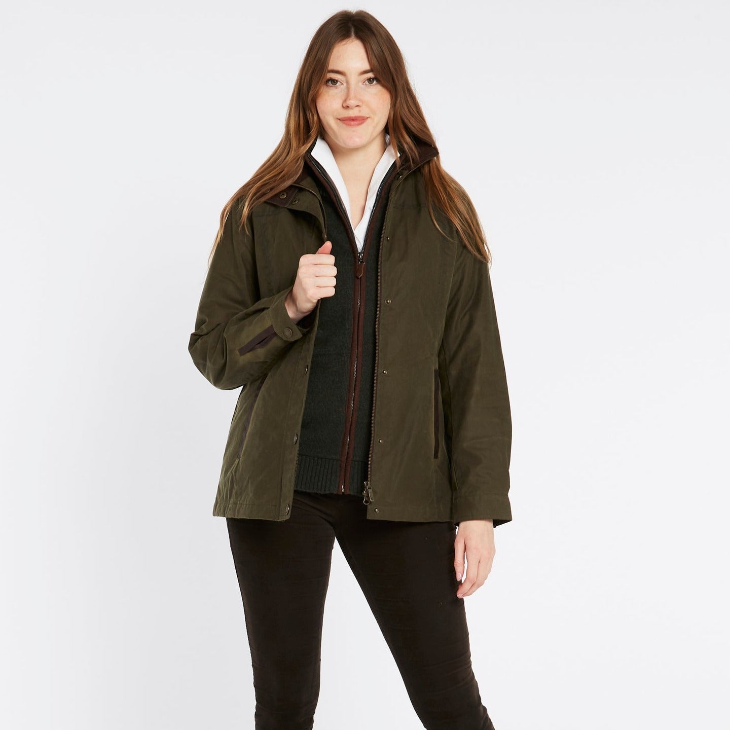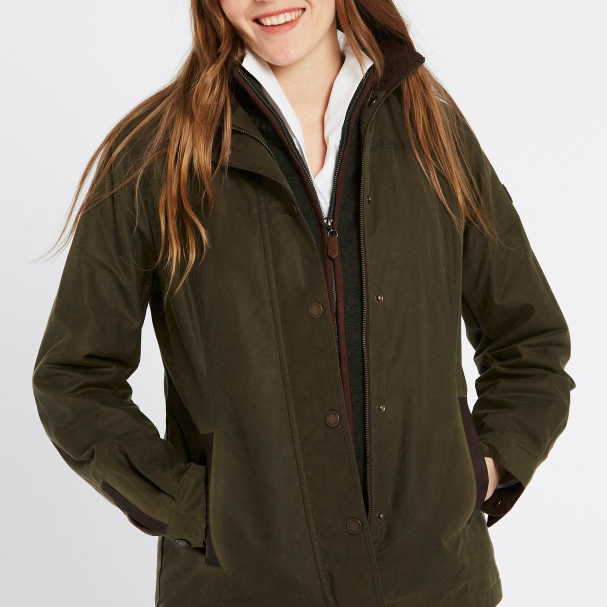 The waxed cotton Dubarry Mountrath is a warm winter jacket with PrimaLoft fill and water repellent finish - perfect for braving wet and windy days in. The leather trim and branded stud poppers lean into a traditional, elegant aesthetic while the stud-fastened faux suede collar and soft, flattering tailoring add a slick urban flair to this comfortable country style.
