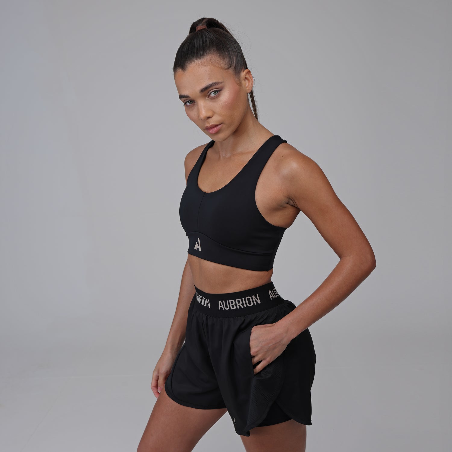 Supportive double-layer cups allow the use of moulded inserts for a custom fit, while a centre seam gives a contoured effect. The layered underband system offers performance support without restricting movement. Overlocked stitching ensures bulk-free flat seams to prevent chafing.