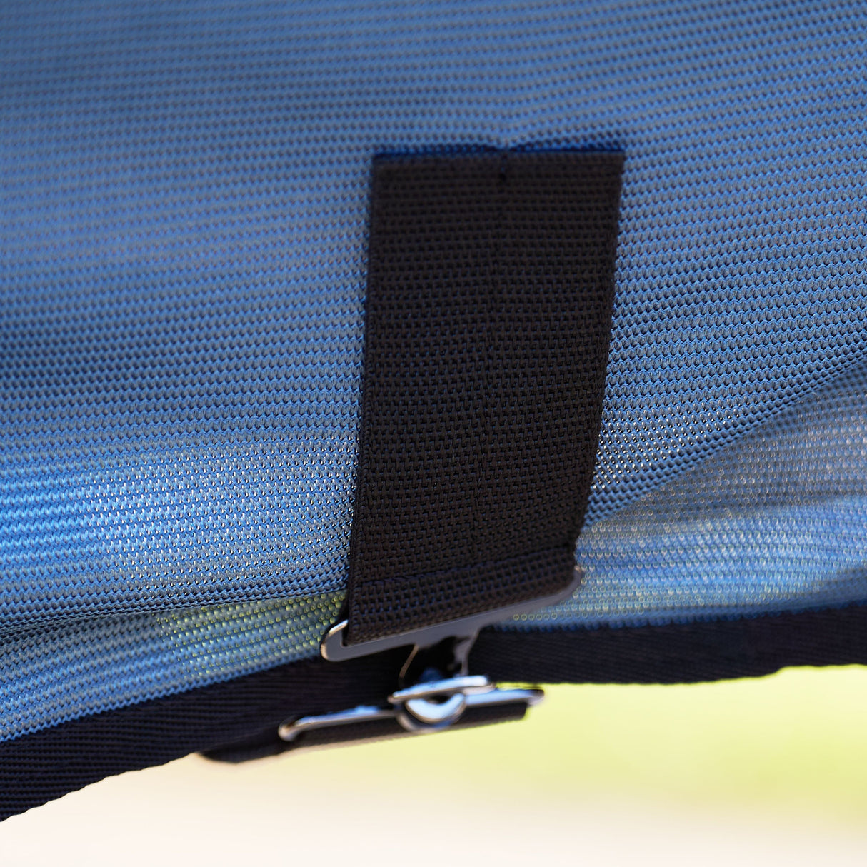 This transport blanket is crafted from breathable mesh fabric, ensuring optimal airflow during travel. It features a double front closure for secure fastening, providing comfort and protection for your horse on the journey. The metal logo ont front closure coin is a stylish detail.