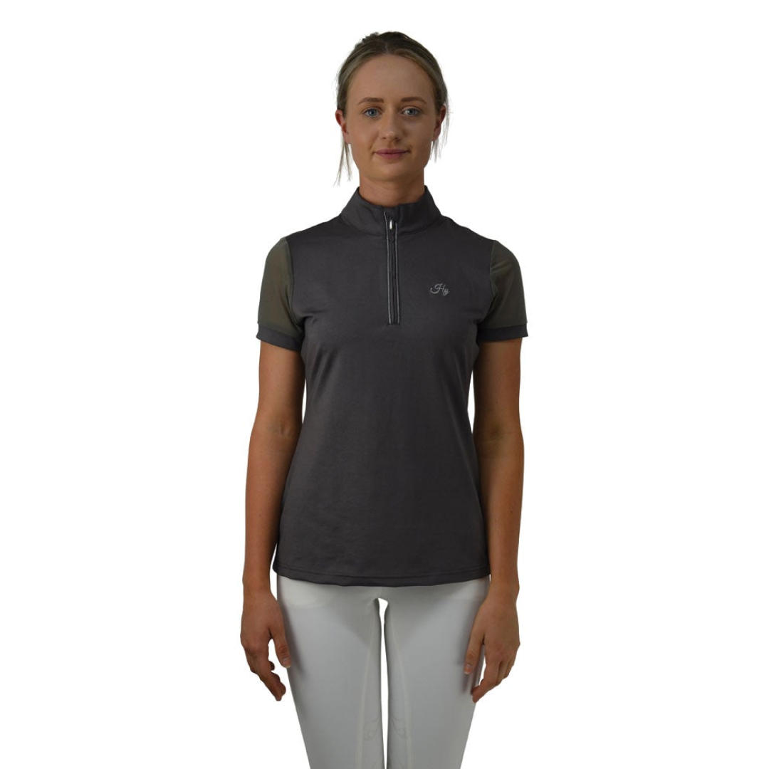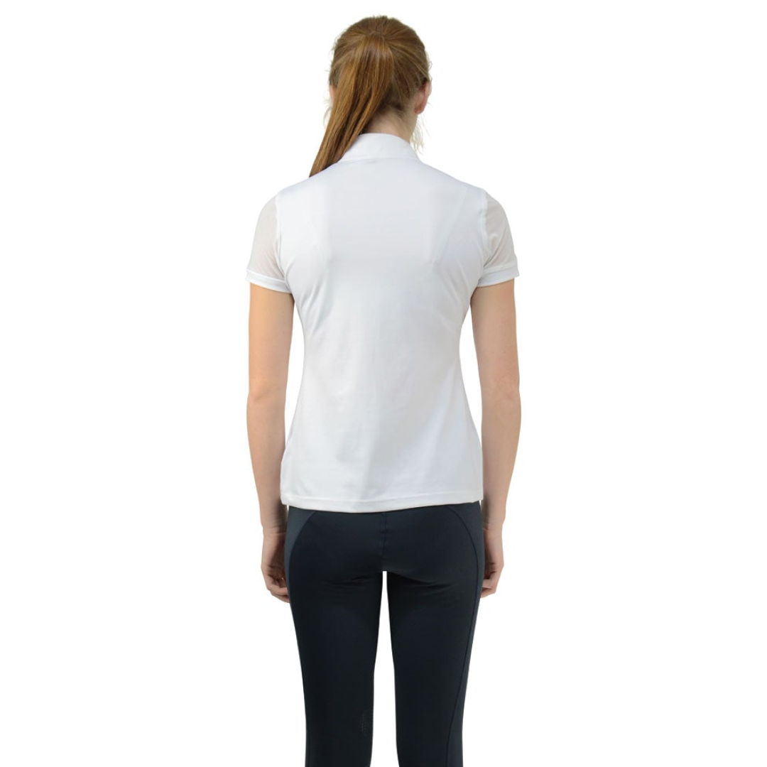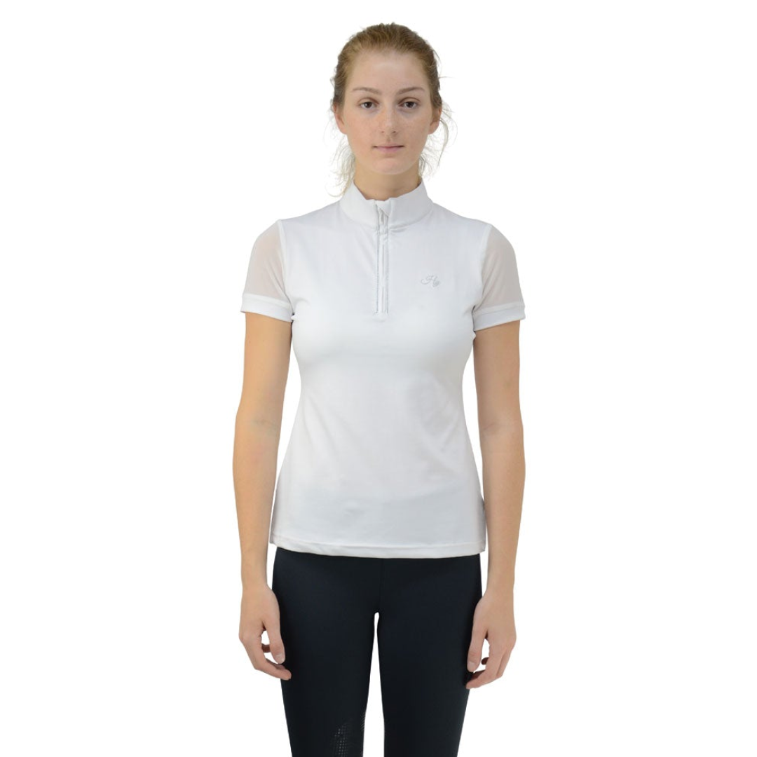 Cette élégante chemise de concours est tendance et magnifiquement conçue avec des manches en maille et des détails argentés entourant le col zippé. Cette chemise respirante de haute qualité sèche rapidement et est confortable avec un matériau flexible assurant une sensation de fraîcheur lors d'une journée chaude. Cette chemise est féminine et sophistiquée. Complété par les détails Hy sur la poitrine.
