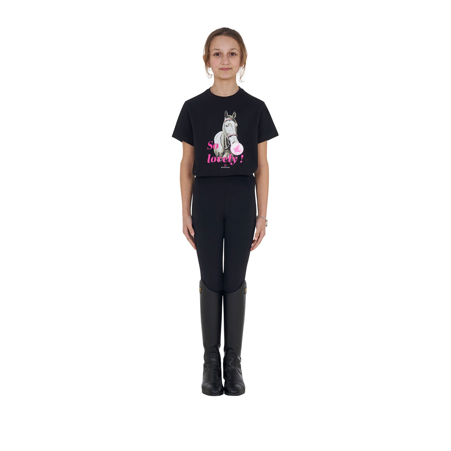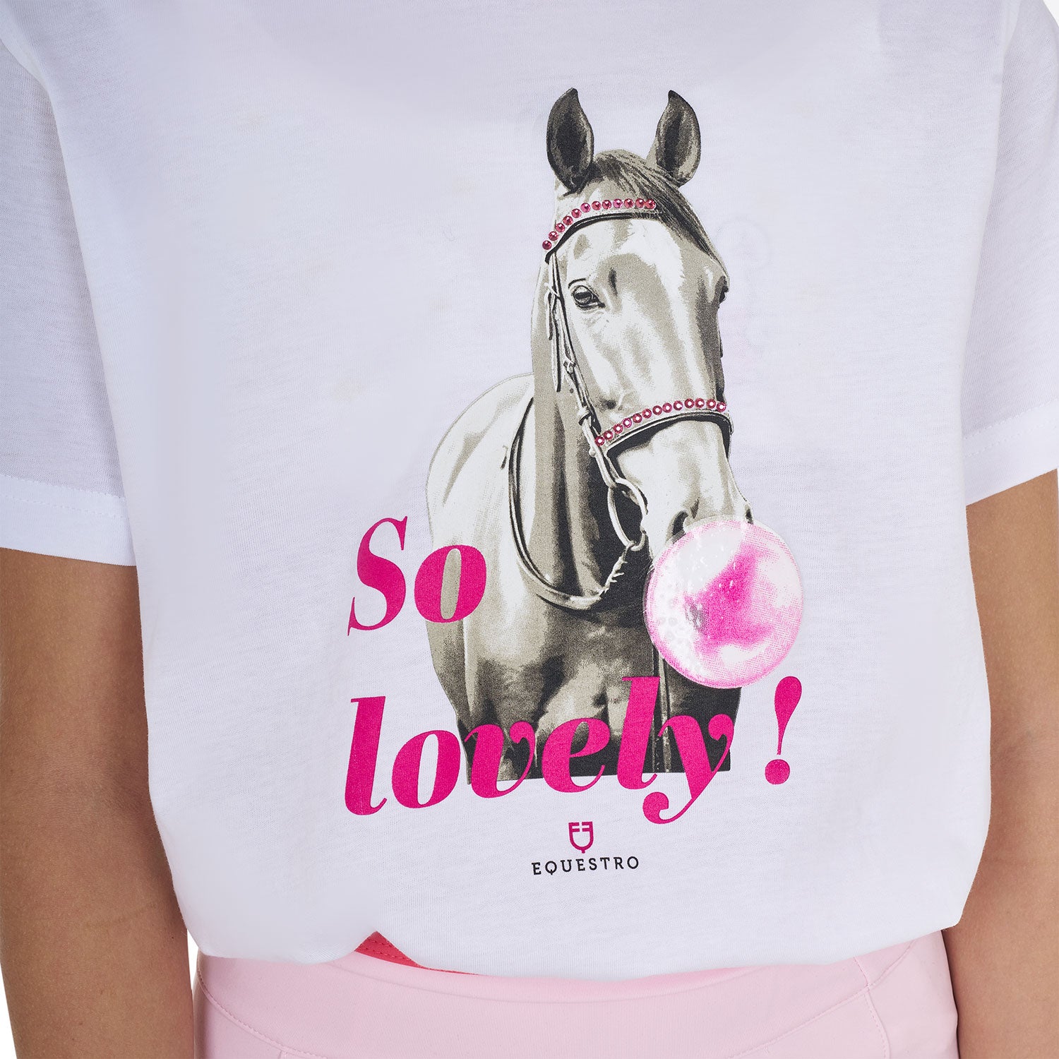 Girls' slim fit short-sleeved cotton T-shirt with pink print and lettering. Featuring breathable technology and essential fit to offer steady comfort. Girls' slim fit T-shirt in soft, high-quality cotton, designed to offer lightweight comfort and a shaped fit that enhances the female silhouette. Featuring a ribbed crew neck and short sleeves, it stands out for its essential and fashionable design. The clean lines are enriched by unique details, such as the Equestro logo and lettering, as well as the refined print on the chest depicting a black and white horse and "So Lovely" lettering. A versatile garment that combines elegance and style, perfect for a sporty yet chic look with a distinctive touch.