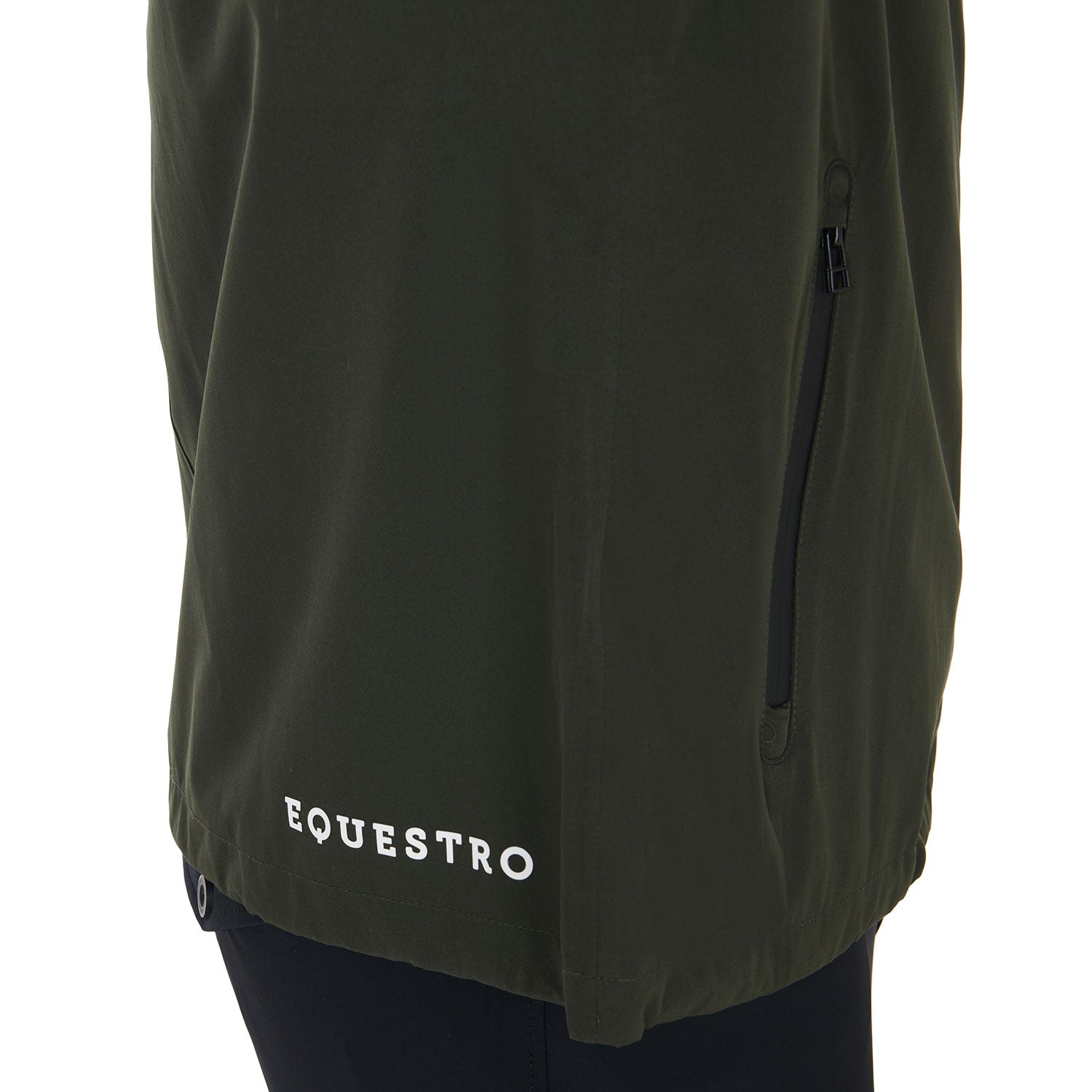 The Equestro Men's Three-Layer Technical Raincoat offers superior protection with its water-repellent, breathable membrane and fully thermo-laminated seams and zips. Designed for maximum comfort and freedom of movement, it features an adjustable hood with removable visor, double slider zip, and customizable waist and wrist drawstrings. Ideal for training or racing in wet, windy conditions, this raincoat keeps you dry and comfortable no matter the weather.