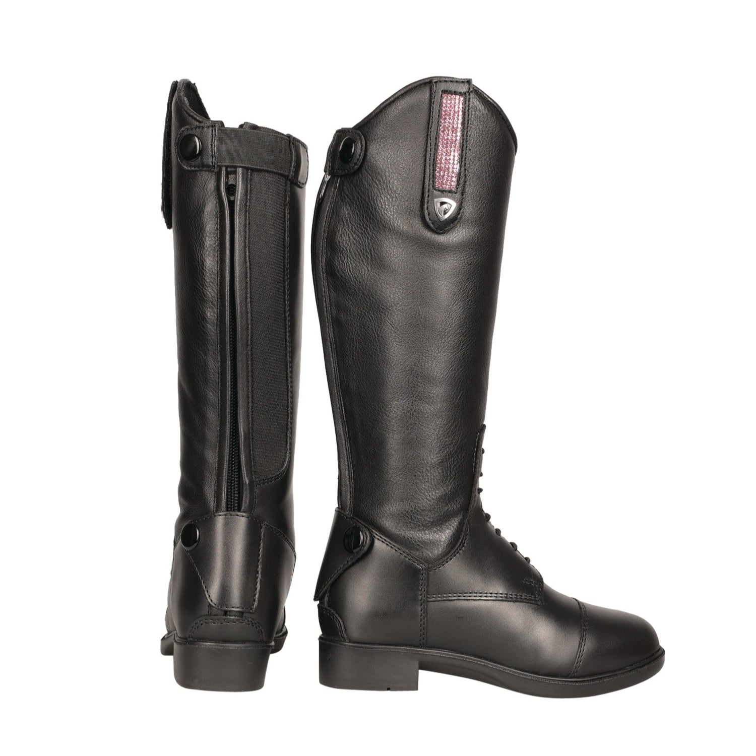 Choose your style! This traditional field boot features an interchangeable swagga for an eye catching look – pick from plain, silver diamantes or pink diamantes to suit each outfit. Made from a combination of real and synthetic leather with sturdy zip for ease of fastening and close contact feel, with secure top press stud closure. Including spur guard at the bottom of the boot and durable anti-skid sole for stability. The perfect addition to your boot collection, whether to wear every day or save for best.