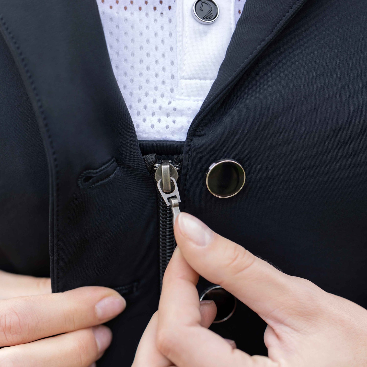 The HKM Ladies Competition Jacket -Amalfi- is the epitome of elegance and functionality. Made of crease-resistant material with a dirt-repellent surface, this jacket guarantees a flawless appearance. The concealed zip and rhinestone accents add a touch of sophistication, while riding slits and practical pockets provide maximum comfort.